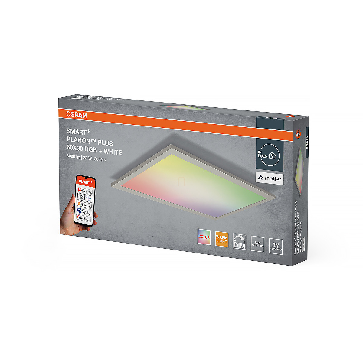 Osram Smart+ Matter Planon Plus Multicolor szabályozható mennyezeti RGB LED panel, 28 W, 2000 lm, 3000 K +RGB, dimmelhető, 60x30 cm