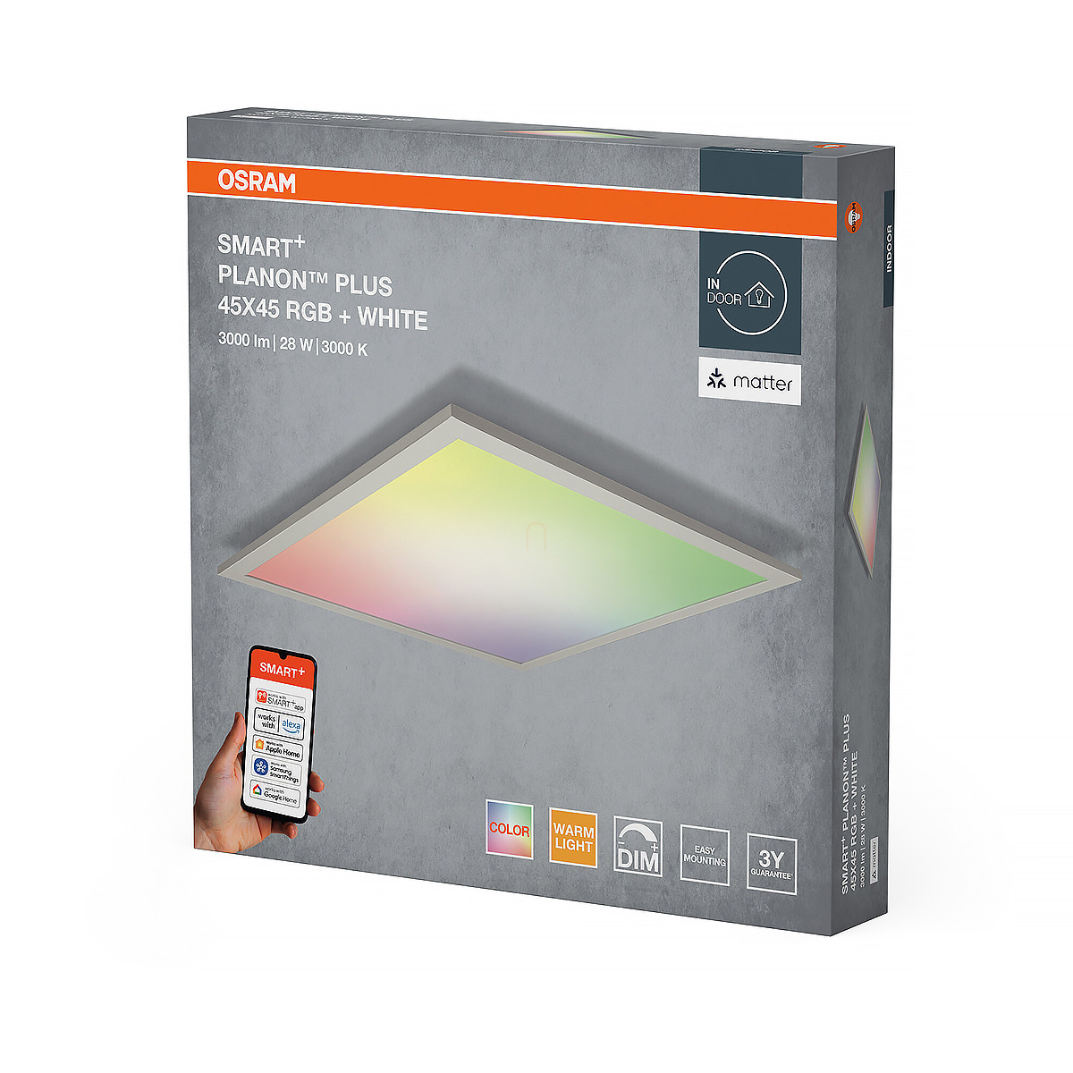 Osram Smart+ Matter Planon Plus Multicolor szabályozható mennyezeti RGB LED panel, 28 W, 2100 lm, 3000 K +RGB, dimmelhető, 45x45 cm