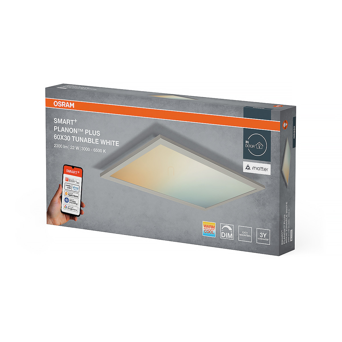 Osram Smart+ Matter Planon Plus szabályozható mennyezeti LED panel, 60x30 cm, 22 W, 1600 lm, 3000-6500 K, dimmelhető