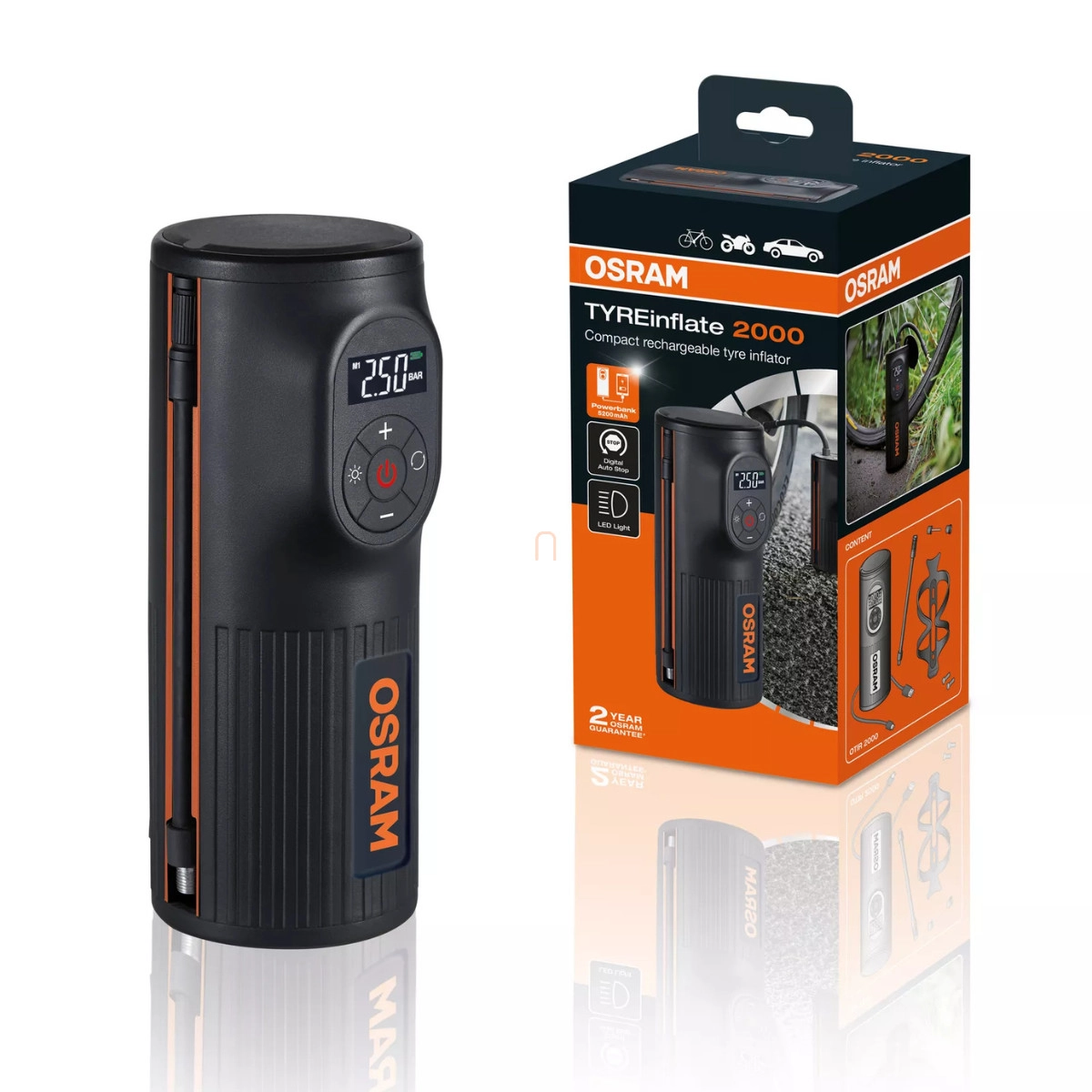 Minden helyzetben számíthatsz rá: az Osram TYREinflate 2000 egy kompakt méretű, bárhol és bármikor használható, újratölthető gumiabroncs-légkompresszor. Nincs szüksége 12V-os hálózatra, hiszen beépített akkumulátor biztosítja a megfelelő energiaellátást. Segítségével nemcsak autód, de kerékpárod, motorkerékpárod, vagy robogód abroncsát is felfújhatod. Nagyméretű, jól olvasható kijelzője PSI, kPA és BAR értékek kijelzésére képes. A készülék maximális nyomása 120 PSI/8,3 BAR.