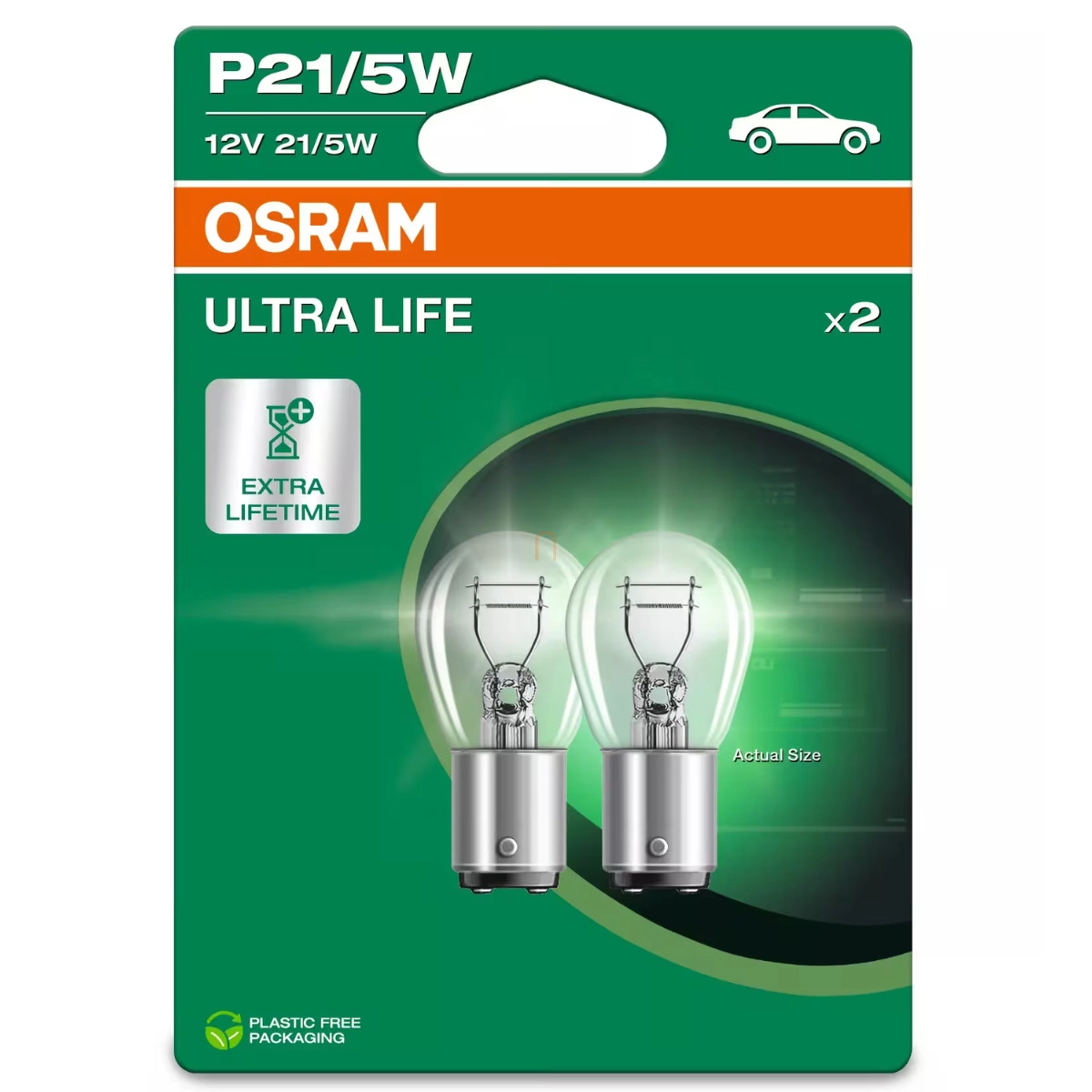 Osram Ultra Life P21/5W jelzőizzó, 12V, BAY15d foglalat, hosszú élettartam akár négyszeres, megbízható fény nappali menetfényhez és hátsó lámpákhoz, 7528ULT-2BL