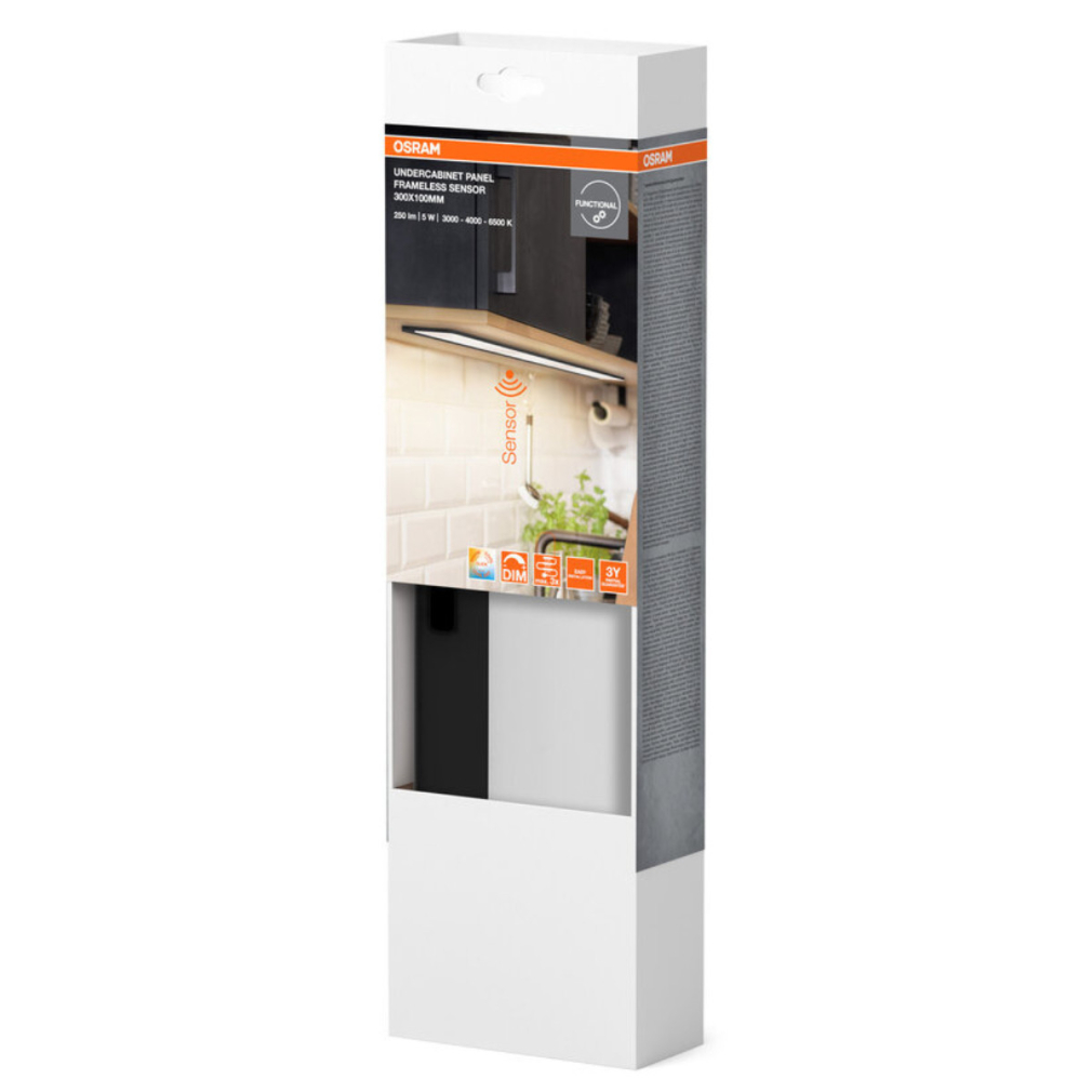 Szabályozható pultvilágító LED lámpa, szenzoros, 30x10 cm, fekete - Osram Undercabinet Panel Frameless, 3000/4000/6500 K, 220 lm, állítható színhőmérséklet és fényerősség, 5 W, 1.5 máteres kábellel, 220-240 V