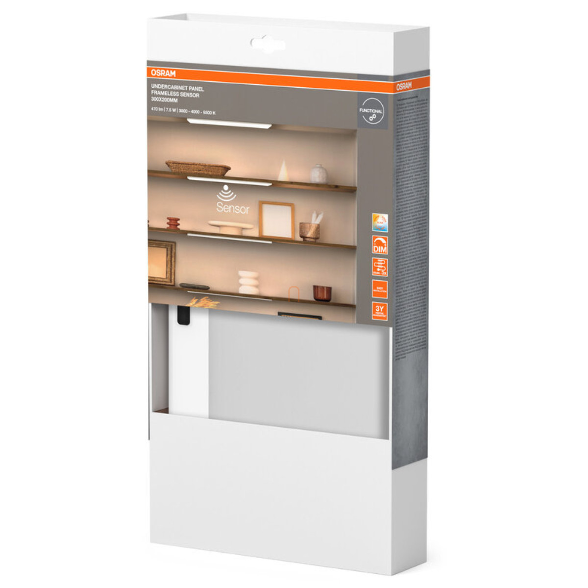 Szabályozható pultvilágító LED lámpa, szenzoros, 30x20 cm, fehér - Osram Undercabinet Panel Frameless, 3000/4000/6500 K, 450 lm, állítható színhőmérséklet és fényerősség, 7,5 W, 1.5 máteres kábellel, 220-240 V