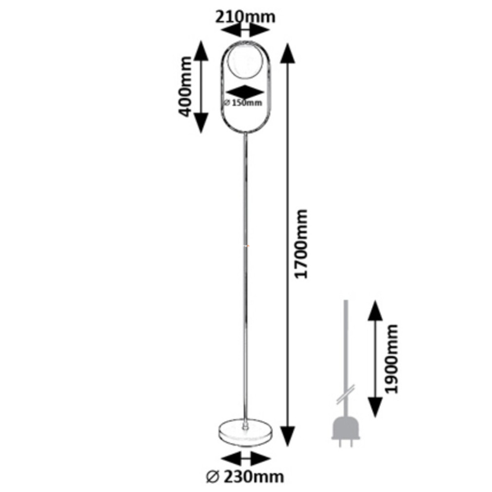 A Ghita Rábalux 74029 ovális állólámpa 170 cm magasságával és modern formatervezésével ideális választás beltéri világítási megoldásokhoz. A lámpatest E27 foglalattal rendelkezik, amely egy darab cserélhető fényforrást fogad, így a fényáram, fényszín, teljesítmény és színhőmérséklet a választott izzótól függően alakítható. A termék fő anyaga fém és üveg, színe fekete-fehér kombináció, amely letisztult megjelenést biztosít. Az állólámpa nem szabályozható, IP20 védettséggel rendelkezik, így kizárólag beltéri használatra alkalmas. A termék tömege 4,015 kg, szélessége 210 mm, magassága 1700 mm. A csomagolás méretei: 26 cm szélesség, 23 cm hosszúság, 46 cm magasság. A lámpa nem tartalmaz fényforrást, így azt külön szükséges beszerezni. Gyártója a Rábalux, logisztikai kódja 74029.