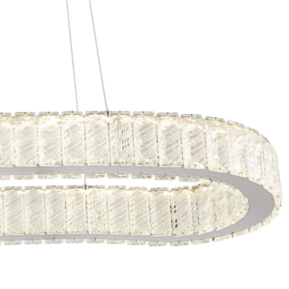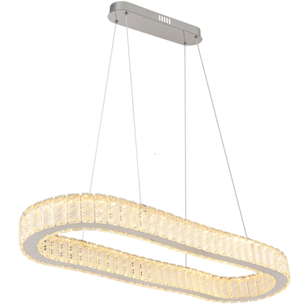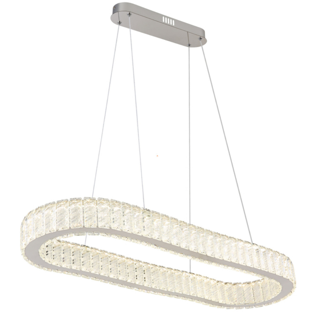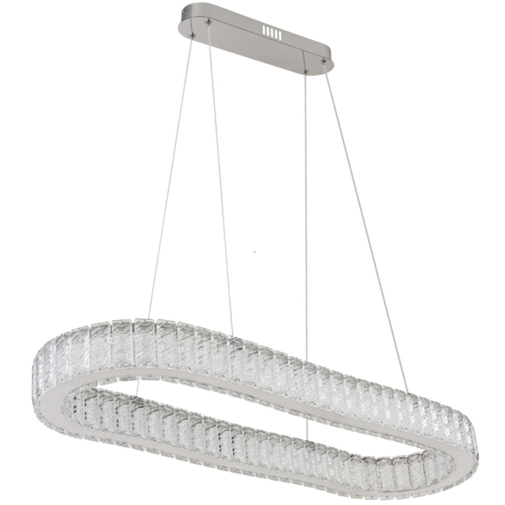 A Mucky Globo 67162-58 ovális függesztett LED lámpa modern világítási technológiát és elegáns formatervezést egyesít. A lámpatest króm színű fém szerkezetből készült, amelyet K5 kristály berakások díszítenek, így különleges fényhatást biztosítanak. A beépített 58 W-os LED modul 3566 lumen fényáramot nyújt, a fény színhőmérséklete pedig 2700 és 6000 Kelvin között változtatható, lehetővé téve a hidegfehértől a melegfehérig terjedő világítás beállítását. A lámpa szabályozható falikapcsolóval és a mellékelt távirányítóval, amely memória és éjjeli fény funkcióval is rendelkezik. Az IP20 védettségi szint beltéri használatra teszi alkalmassá. A lámpatest méretei: 890 mm hosszúság, 310 mm szélesség és 1200 mm magasság, tömege 6,5 kg. A termék tartalmazza a LED fényforrást, így az azonnal üzembe helyezhető.