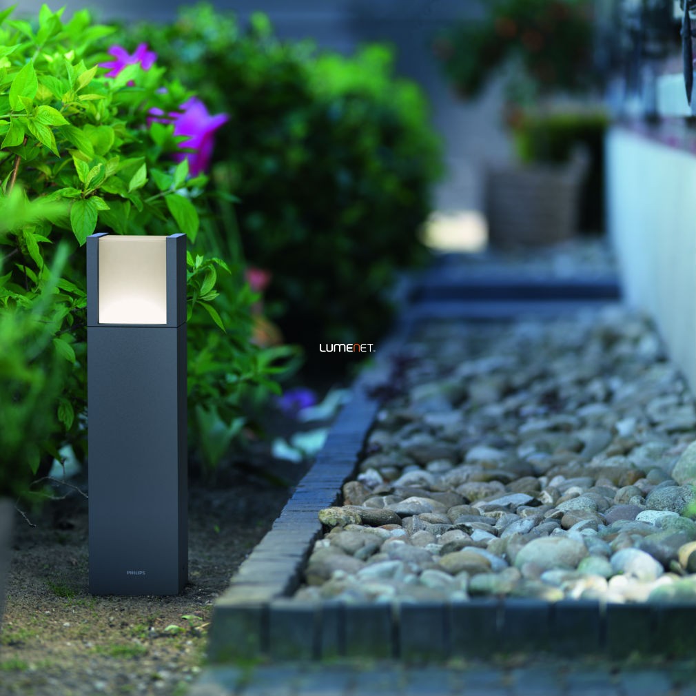 Az antracitszürke Philips Arbour LED kültéri talapzatos lámpánál egy fénykocka függeszkedik egy tartós, fröccsöntött alumíniumból készült tartóegység belsejében. Az ötletes forma szórt melegfehér fénysugarakkal ragyogja be a járdákat és az egyéb külső tereket.