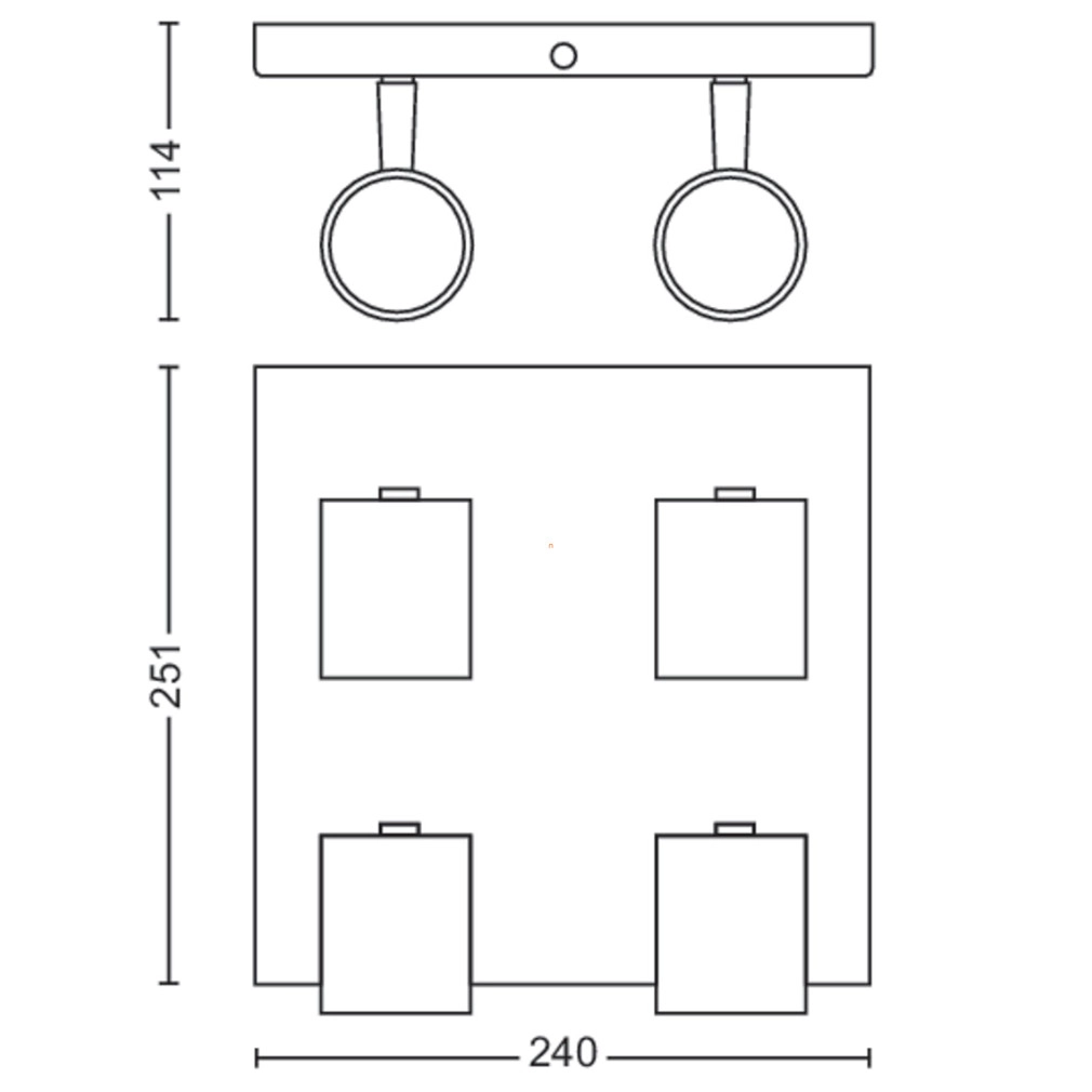 A Philips Runner négy karos, mennyezetre szerelhető spot lámpa modern, letisztult kialakítással rendelkezik, fekete színben. A lámpatest fém anyagból készült, méretei 109 mm hosszúság, 240 mm szélesség és 240 mm magasság. Négy darab GU10 foglalattal ellátott, amelyekhez cserélhető fényforrás használható, a fényforrásokat a csomag nem tartalmazza. A lámpatest 220-240 V névleges feszültségen üzemel, maximális védettsége IP20. Nem szabályozható, így egyszerű, stabil fényforrást biztosít. A termék tömege 1,16 kg, csomagolási méretei 11x25x25 cm. A gyártó a Signify.