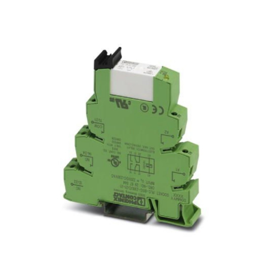 PLC interfész, PLC-BSP .../21 alapkapocsból, csavaros csatlakozással és dugaszolható teljesítmény-érintkezős miniatűr jelfogóval, NS 35/7,5 alapsínre szerelhető, 2 váltóérintkező, bemeneti feszültség: 230 V AC/220 V DC