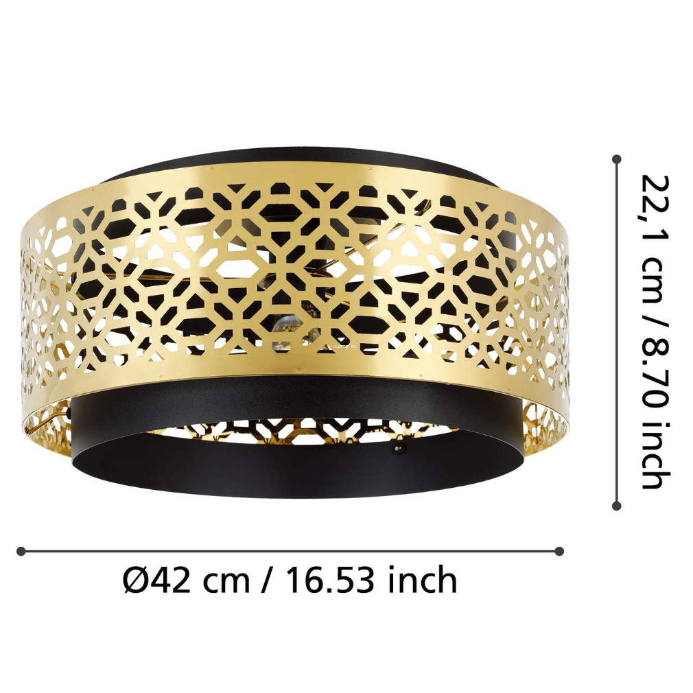 A Sandbach Eglo 43979 mennyezeti lámpa sárgaréz és fekete színkombinációval, modern megjelenést kölcsönöz bármely helyiségnek. A lámpatest acélból készült, amely tartósságot és stabilitást biztosít. Egy darab E27-es foglalattal rendelkezik, amely cserélhető fényforrás használatát teszi lehetővé, így a fényáram, fényszín, teljesítmény és színhőmérséklet egyedileg választható meg. A lámpa átmérője 420 mm, magassága 220 mm. IP20-as védettségi besorolással rendelkezik, így beltéri használatra alkalmas. A termék nem tartalmaz fényforrást. A csomagolás méretei: 43 cm szélesség, 17 cm hosszúság és 43 cm magasság, a teljes tömeg 1,563 kg. A gyártó az EGLO.