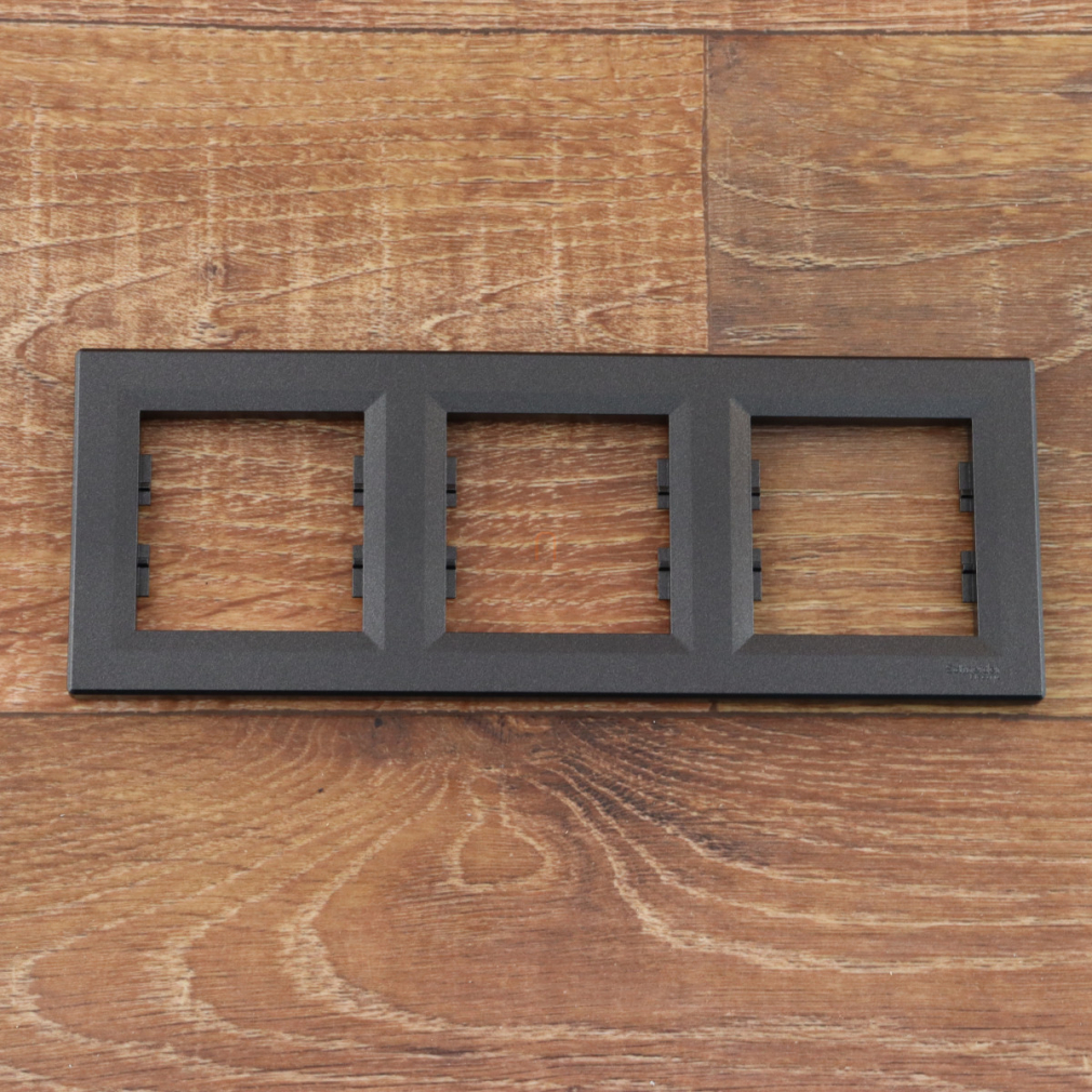 ASFORA Hármas keret, vízszintes, antracit. termékcsalád: Asfora - termék vagy komponens típusa: Takaró keret - színes árnyalat: antracit - a csomagolás típusa: flow-pack. Előnyök : Szakítson a hagyományokkal és a megszokásokkal, használjon színes szerelvényeket a különböző világítási és komfortfunkciókhoz is., Redőnyvezérlés, Jelzőfényes kapcsoló, Fényerőszabályzó. A csatlakozók széles választékának köszönhetően nem marad le semmiről és igazán önfeledten élvezheti szabadidejét, hiszen számos funkció szolgálja az Ön kényelmét:, TV/R/SAT aljzat, RJ45 adatcsatlakozó, Hangszórócsatlakozó. Amellett, hogy az Asfora termékek elegáns vonalvezetésükkel stílust adnak otthonának, megfelelnek az aktuális szabványoknak, masszív és időtálló anyagból készülnek., Csapfedeles csatlakozóaljzat, IP44-es csatlakozóaljzat.. Alkalmazások: Otthoni, irodai és közösségi épületekben..