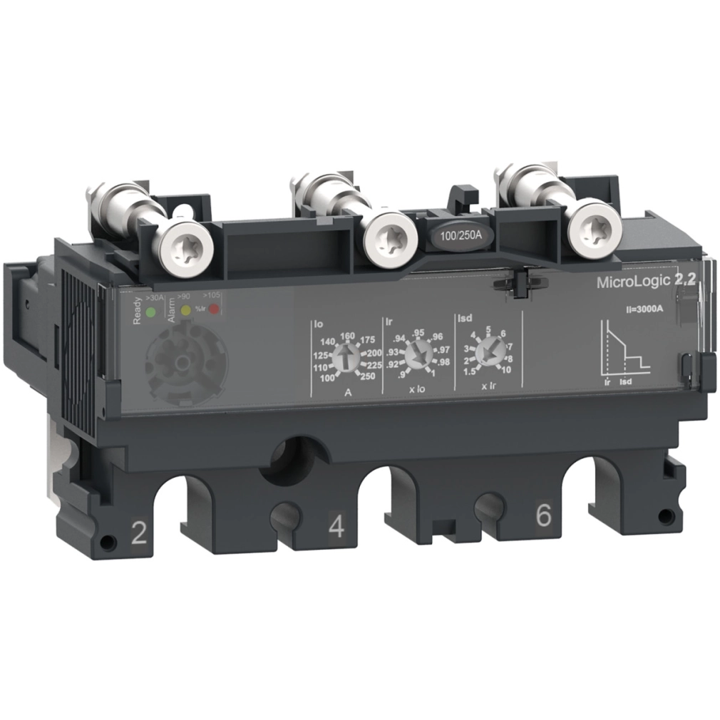 Ez a MicroLogic 2.2 egy 3 pólusú, 3D elektronikus kioldóegység, amelyet a ComPacT NSX 160/250 megszakítókon használnak. Ez a 160A névleges teljesítményű elektronikus kioldóegység optimális választás minden szabványos és speciális alkalmazáshoz. Állítható, hosszú idejű túlterhelés elleni védelmet tartalmaz. Ezenkívül állítható rövid távú védelmet és fix azonnali védelmet biztosít a rövidzárlat ellen. A MicroLogic 2.2 riasztási LED-ekkel jelzi a túlterhelést. A zöld Ready LED villog, ha a megszakító készen áll a kioldásra. Ez a termék az EcoStruxure Power architektúránk része, ha a PowerTag NSX és a ComPacT NSX alapkerethez van társítva.