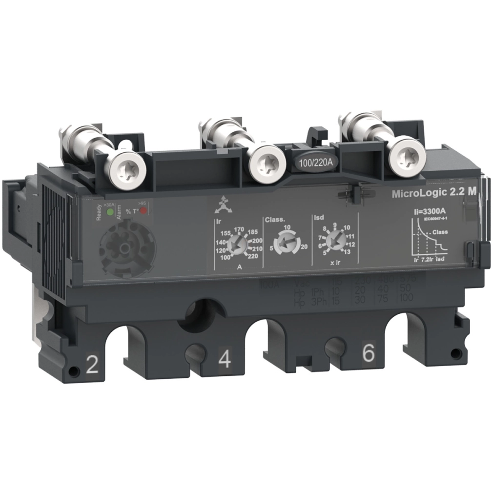 Ez a MicroLogic 2.2 M egy 3 pólusú, 3D elektronikus kioldóegység, amelyet a ComPacT NSX 250 megszakítókon használnak. Ez a 220A névleges teljesítményű elektronikus kioldóegység optimális választás motorvédelmi alkalmazásokhoz. Állítható, hosszú idejű túlterhelés elleni védelmet tartalmaz. Ezenkívül állítható rövid távú védelmet és fix azonnali védelmet biztosít a rövidzárlat ellen. A MicroLogic 2.2 M piros Riasztás LED-del jelzi, ha a forgórész és az állórész hőképe meghaladja a megengedett hőmérséklet-emelkedés 95%-át. A zöld Ready LED villog, ha a megszakító készen áll a kioldásra. Ez a termék az EcoStruxure Power architektúránk része, ha a PowerTag NSX és a ComPacT NSX alapkerethez van társítva.
