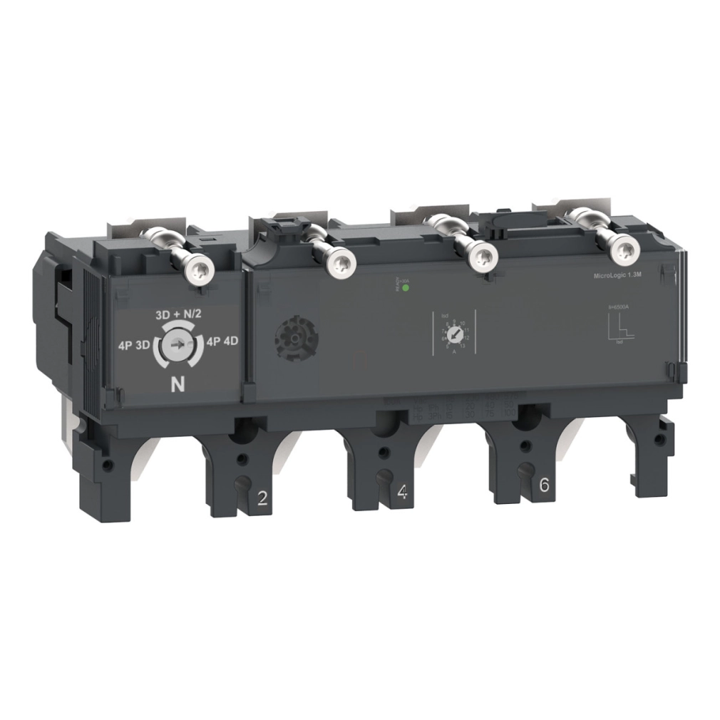 Ez a MicroLogic 1.3 M egy 4 pólusú, 3D elektronikus kioldóegység, amelyet a ComPacT NSX 400/630 megszakítókon használnak. Ez a 320A névleges teljesítményű elektronikus kioldóegység optimális választás motorvédelmi alkalmazásokhoz. Állítható rövid idejű védelmet és fix azonnali védelmet biztosít a rövidzárlat ellen. A zöld Ready LED villog, ha a megszakító készen áll a kioldásra. Ez a termék az EcoStruxure Power architektúránk része, ha a PowerTag NSX és a ComPacT NSX alapkerethez van társítva.
