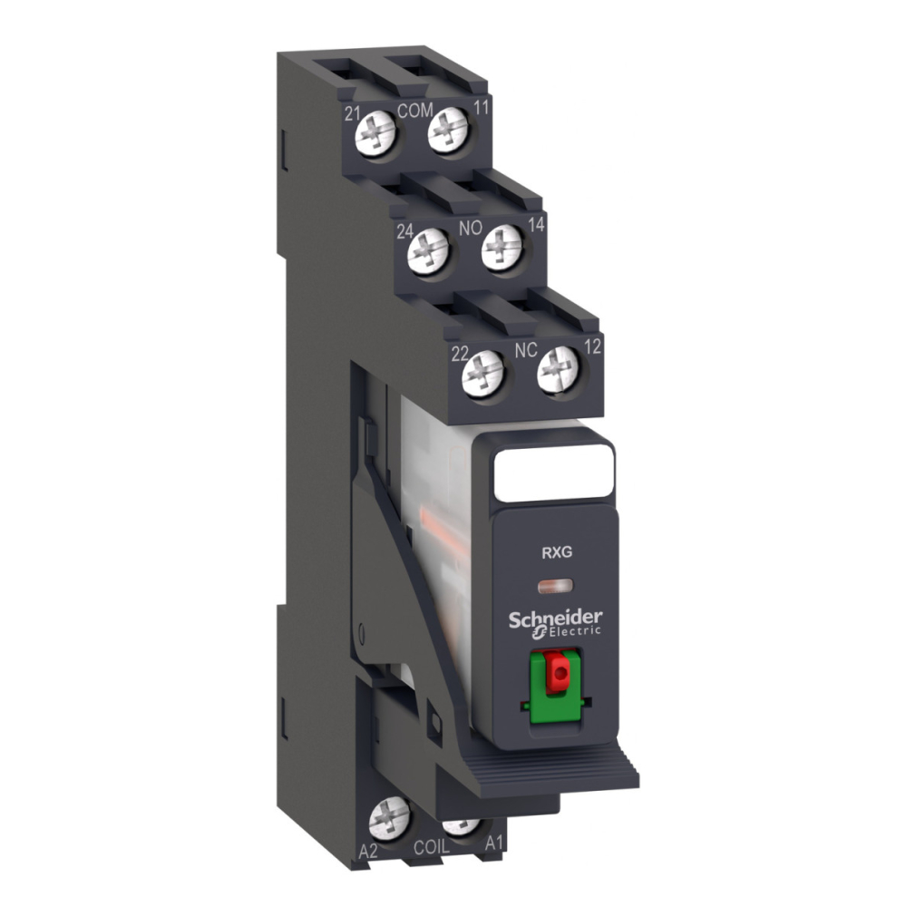 A Schneider Electric RXG21P7PV relé 230 V AC vezérlőfeszültséggel működik, és 2 váltóérintkezővel (2CO) rendelkezik, amelyek maximum 5 A áramerősséget képesek kapcsolni. A készülék különleges tulajdonsága a zárható tesztgomb, amely lehetővé teszi a működés ellenőrzését és a rendszer tesztelését karbantartás során. A relé kivitele csavaros bekötést biztosít a megbízható elektromos csatlakozás érdekében. A készülék nem rendelkezik állapotjelző LED-del, ami bizonyos alkalmazási területeken előnyös lehet.