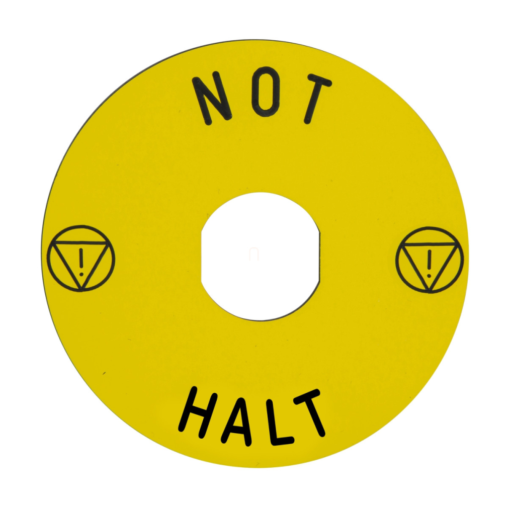 A ZBY8230 jelölőcímke kiváló minőségű műanyagból készül, ami biztosítja a hosszú élettartamot ipari környezetben is. A sárga háttér és a fekete "NOT-HALT" felirat kontrasztos kombinációja már messziről is jól látható, így vészhelyzet esetén a kezelőszemélyzet gyorsan azonosíthatja a vészleállító gombot. A címke központi nyílással rendelkezik, amely lehetővé teszi a könnyű felszerelést a megfelelő Harmony XB4 és XB5 sorozatú nyomógombokra. A feliraton túl a címke tartalmazza az ISO13850 szabvány szerinti vészleállító szimbólumokat is, amelyek nemzetközileg értelmezhetők, függetlenül a kezelőszemélyzet nyelvi ismereteitől.