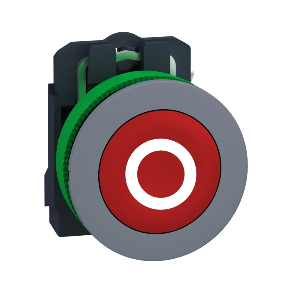 A termék 30 mm-es szabványos szerelési átmérővel rendelkezik, ami lehetővé teszi a gyors és egyszerű telepítést az ipari vezérlőpanelekbe. A nyomógomb jellegzetes piros színű, süllyesztett kialakítású, fehér "O" jelöléssel, amelyet szürke színű körgyűrű vesz körül, így biztosítva a jó láthatóságot különböző fényviszonyok között is. A termék rugós visszatérítésű működésű, ami azt jelenti, hogy a gomb megnyomás után automatikusan visszatér alaphelyzetbe. Ez a típus 1 NC (alaphelyzetben zárt) érintkezővel rendelkezik, ami számos vezérlési feladathoz ideális.
