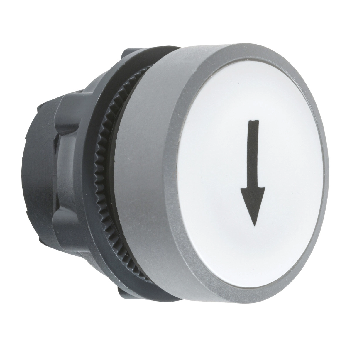 A ZB5AA334C0 nyomógomb fej fehér színű, süllyesztett kialakítású, fekete felfelé mutató nyíl szimbólummal ellátott kezelőfelülettel rendelkezik, amelyet szürke színű, műanyag bevonatú keret vesz körül. A szabványos, 22 mm-es szerelési átmérőnek köszönhetően könnyen beépíthető különböző vezérlőpanelekbe és kezelőfelületekbe. A rugós visszatérő működés biztosítja, hogy a nyomógomb mindig visszatérjen alaphelyzetbe a megnyomás után, így ideális pillanatkapcsolóként való használatra. A nyomógomb fej köralakú kialakítása nem csak esztétikus, de funkcionális szempontból is előnyös, mivel megkönnyíti a kezelést és a felismerést.