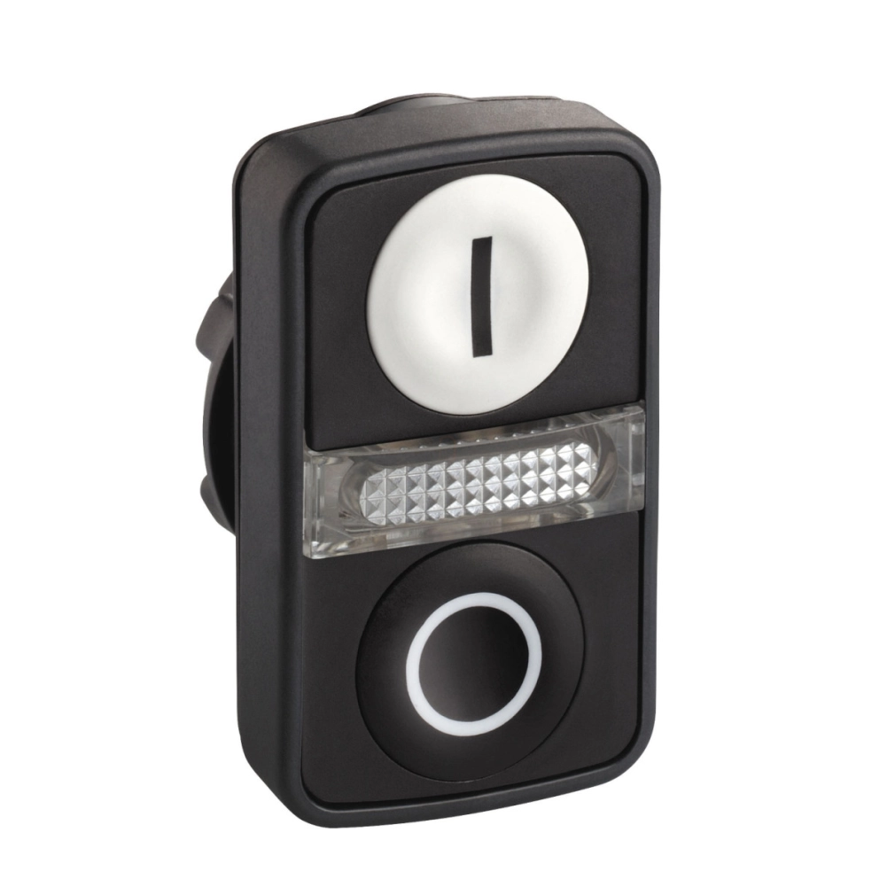 \nFehér sülly./fekete sülly. világító kétfejű nyomógomb Ø22 jelöléssel. termékcsalád: Harmony XB5 - termékkompatibilitás: beépített LED - készülék rövid megnevezése: ZB5 - fej típusa: szabványos - szerelési átmérő: 22 mm - kezelő profilja: 2 süllyesztett nyomógomb - 1 központi ellenőrzőlámpa - kezelők leírása: fehér ''I'' - fekete ''O''. Előnyök : - A Harmony vezérlő állomások, vezérlőegységek és jelzőegységek segítségével egyetlen termékcsaládon belül ad megoldást, egyszerűsíti a választást -:, Komplett vezérlőállomások keszre szerelt nyomógombokkal, Üres tokozatok egyedi felhasználói igényekhez, Széles kínálat nyomógombokból és kiegészítőkből a leggyakoribb funkciókhoz, Vegyi anyagokkal szembeni ellenállás, kettős villamos szigetelésű változatban is.... Alkalmazások: - Ipar: egyszerű és tömegtermelésben haszmnált gépek: textil, csomagolás, anyagmozgatás, stb., Épületek és infrastruktúra: kisemelő rendszerek, garázskapuk, redőnykapuk, füstelszívók vezérlése stb.... Előnyök : - Nagy teljesítmény a vegyi környezetben (tisztító- és oldószerek, alkohol, mosószer, vágóolaj, tej), Rugalmasság és alkalmazkodóképesség a moduláris felépítésből következően, A telepítés egyszerűsége és gyorsasága, Széles kínálat, amely megoldást nyújt minden alkalmazásához, Attractive design, reinforced with the flush mounting kit.. Alkalmazások: Általános célú ajánlat minden szegmensre és alkalmazásra: Industry., Gépek és vezérlőpanelek a csomagolásban, anyagmozgatásban, szivattyúzásban stb., Ideális szélsőséges környezeti feltételek között: élelmiszeripar, tengerhajózás, stb. Épületek és infrastruktúra, Energiaelosztó szekrények, közművek, éttermek, kereskedelmi épületek, repülőterek stb....