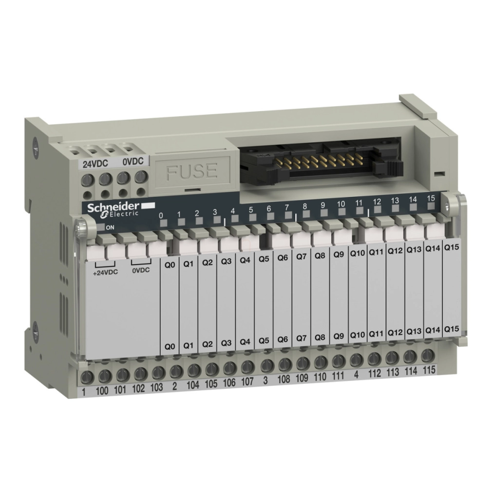 Az ABE7R16T111 sub-base érintkezőinek típusa és összetétele 1 NO (normally open - alaphelyzetben nyitott), ami ideálissá teszi különböző terhelések kapcsolására. A termék rendelkezik státuszjelző LED-ekkel is: 1 LED jelzi a tápfeszültség meglétét, valamint csatornánként 1 LED mutatja az adott csatorna állapotát. A polaritáselosztás 4-es csoportokban történik. A termék rövidzárlat elleni védelemmel is rendelkezik, amely egy 1 A-es belső, gyors kioldású, 5 x 20 mm méretű biztosíték formájában valósul meg a PLC oldalon.