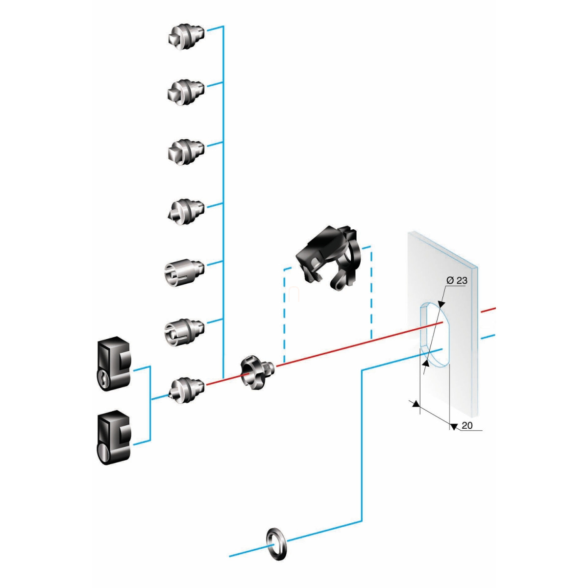 A NSYTDB5PLA zárbetét alkalmazási területe rendkívül sokrétű, hiszen multi-purpose (többcélú) kialakításának köszönhetően számos különböző helyen felhasználható. A termék közvetlen szerelhetőséget biztosít a fogantyún, így telepítése egyszerű és gyors folyamat. A Schneider Electric terméke egy alakzárbetétből és egy kulcsból áll, melyek együttesen garantálják a megbízható és biztonságos lezárást. A zárbetét tervezésekor a gyártó nagy hangsúlyt fektetett a praktikumra és a hosszú élettartamra, ami a Schneider Electric termékeinek egyik védjegye.