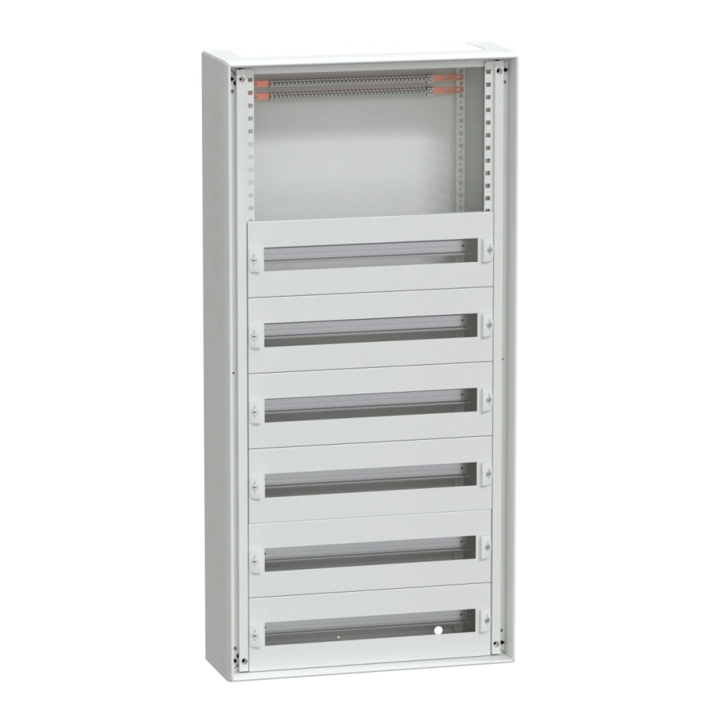 A moduláris kialakítás rendkívüli rugalmasságot biztosít: a szekrény 24 darab 50 mm-es függőleges modult tartalmaz, soronként 24 darab 18 mm-es szabványos modulhely áll rendelkezésre. A szekrények mind egymás mellé, mind egymás tetejére szerelhetők, lehetővé téve komplex elosztórendszerek kialakítását. Az LVS08068 szekrény tartalmazza az 1 db szekrénytestet, 2 db földelőkészletet, 6 db előlapi takarólemezt és 6 db moduláris sínt, viszont a 6M-es szabad zónát külön kell rendelni.