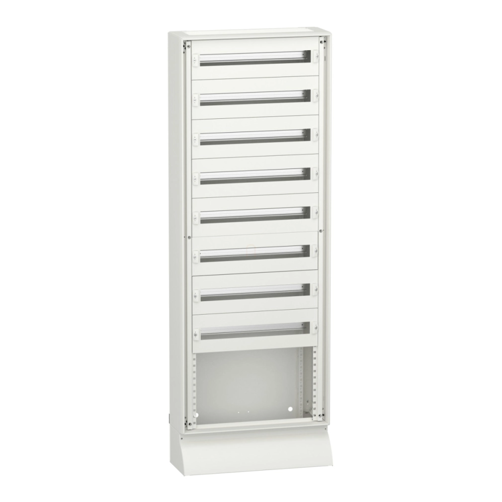 Az LVS08073 modell egy 600 mm szélességű és 1680 mm magasságú, IP30 védettségű álló szekrény, amely 8 vízszintes modulsort kínál, valamint helyet biztosít a betáplálás számára is. A szekrény komplett kivitelben tartalmazza a szükséges tartozékokat: 1 db szekrényt, 2 db földelő készletet, 8 db előlapot és 8 db moduláris sínt. Az előlapok moduláris kialakításúak, ami lehetővé teszi a rugalmas konfigurálhatóságot. A rendszer soronként 24 db 18 mm-es modul befogadására képes, összesen 30 függőleges (50 mm-es) modult tartalmaz. Fontos megjegyezni, hogy a 6M-es szabad zónát külön kell rendelni.