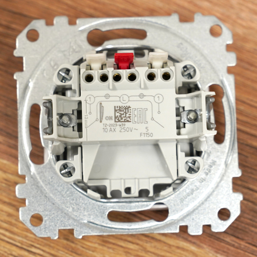 Ez az elegáns, fehér (RAL 9003) színű, fényes felületű csillárkapcsoló a Schneider Electric Sedna Design és Elements prémium termékcsaládjához tartozik, amely a stílusos megjelenést és a megbízható működést ötvözi. Elektromechanikus technológiája hosszú élettartamú és stabil működést biztosít, 10AX névleges áramával és 250 V AC üzemi feszültségével akár 2300 W terhelés kapcsolására is alkalmas, beleértve a maximum 100 W-os integrált előtéttel rendelkező világítótesteket. Egy billentyűvel vezérelhető, így ideális választás egyetlen lámpa vagy csillár irányítására. Süllyesztett kivitelének köszönhetően diszkréten simul a fal síkjába, modern és rendezett megjelenést kölcsönözve a helyiségnek. A rögzítés karmokkal vagy csavarokkal történhet, a karmok állítható tartománya 46–60 mm, így különböző telepítési környezetekben is könnyen beépíthető. Rugós bekötési rendszere gyors és biztonságos vezetékcsatlakoztatást tesz lehetővé, kompatibilis 1,5–2,5 mm² keresztmetszetű merev, sodrott vagy rugalmas kábelekkel, a 13 mm-es vezetékhossz pedig pontos bekötést biztosít. Kompakt méretei – 73x73 mm szélesség és magasság, 37 mm teljes mélység, 24 mm látható rész – helytakarékos és esztétikus telepítést tesznek lehetővé. Anyaga hőre lágyuló, UV-stabilizált ABS, amely ellenáll a színfakulásnak és a mechanikai igénybevételnek, így hosszú ideig megőrzi eredeti állapotát. IP20 védettségi fokozata és IK03 ütésállósága beltéri, száraz környezetben történő biztonságos használatot garantál. A termék környezettudatos kialakítású, 59%-ban újrahasznosított műanyagot tartalmaz, csomagolása újrahasznosított kartonból készült, és megfelel az EU RoHS és REACh előírásoknak. Nem ajánlott kültéri vagy nedves helyiségekben való alkalmazásra. Ez a csillárkapcsoló ideális választás azoknak, akik a Schneider Electric magas színvonalú minőségét, letisztult formatervezését és praktikus, tartós kialakítását keresik egy megbízható, könnyen telepíthető világításvezérlő megoldásban.