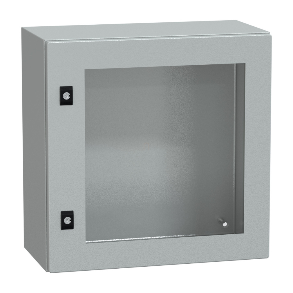 A Schneider Electric PanelSeT CRN termékcsaládba tartozó NSYCRN55250T típusú kompakt elosztószekrény átlátszó ajtóval kivételes minőséget képvisel az ipari alkalmazásokban. Ez a multi-purpose (többcélú) szekrény tökéletes megoldás olyan környezetben, ahol fontos a belső komponensek vizuális ellenőrzése az ajtó felnyitása nélkül. Az IP66 védettség biztosítja a por és erős vízsugár elleni védelmet, míg az IK08 ütésállóság garantálja a mechanikai behatásokkal szembeni ellenállóképességet.