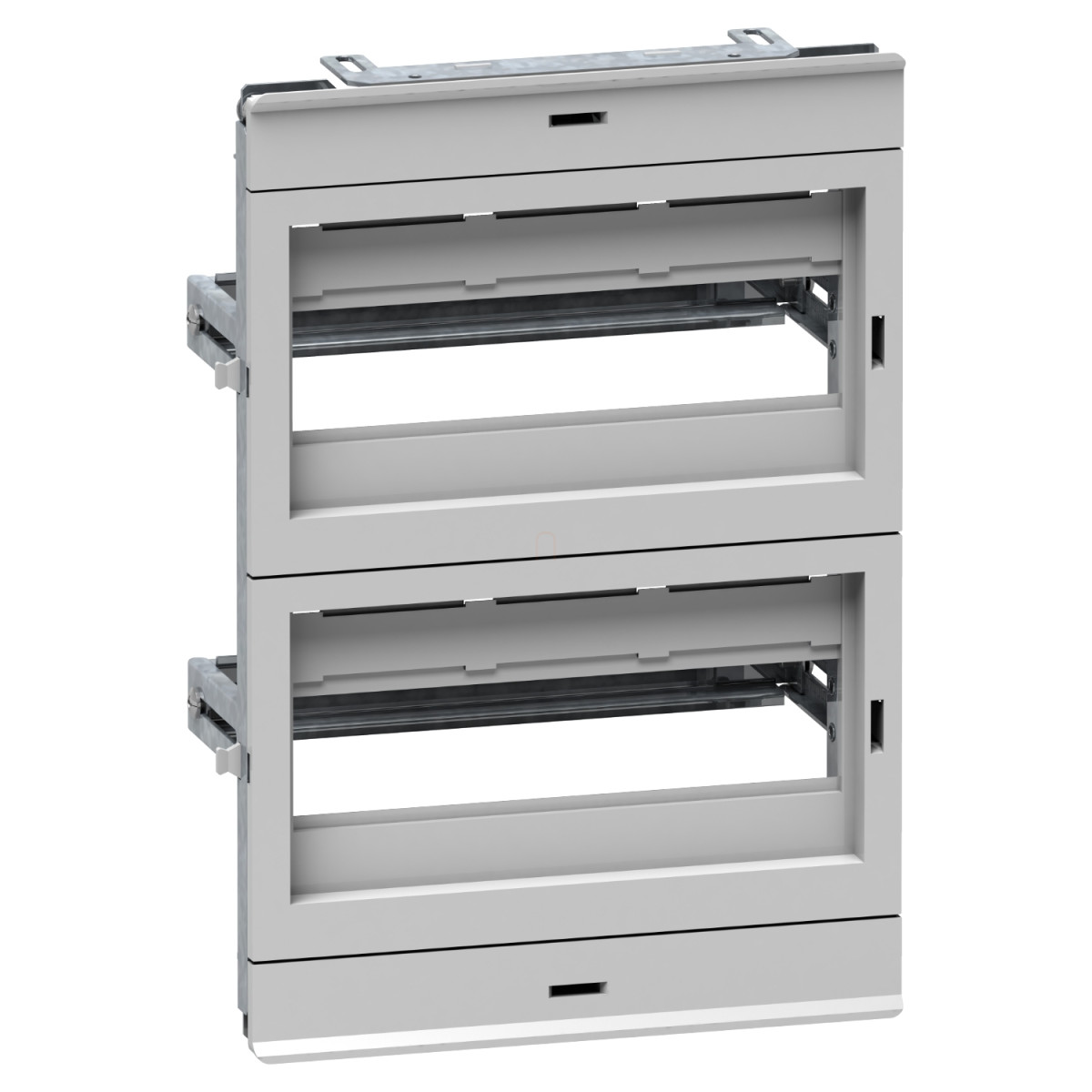 A termék műszaki jellemzői rendkívül előnyösek: az előlap önkioltó szigetelőanyagból készült, míg a vázszerkezet és a sínek acélból. Az előlap szürke színű (RAL 7035), ami biztosítja a professzionális megjelenést. A rögzítés az előlapon történik támasztóelemekkel, és a DIN-sínek magassága 40-85 mm között állítható, ami nagyfokú rugalmasságot biztosít a szerelés során. A termék 2 vízszintes sorral rendelkezik, és összesen 24 darab 18 mm-es modult képes befogadni. Az előlapok sima és kivágott kivitelben készültek, összesen 2 kivágással. A chassis méretei: 380 mm magasság és 260 mm szélesség, ami optimális helykihasználást tesz lehetővé a szekrényben.