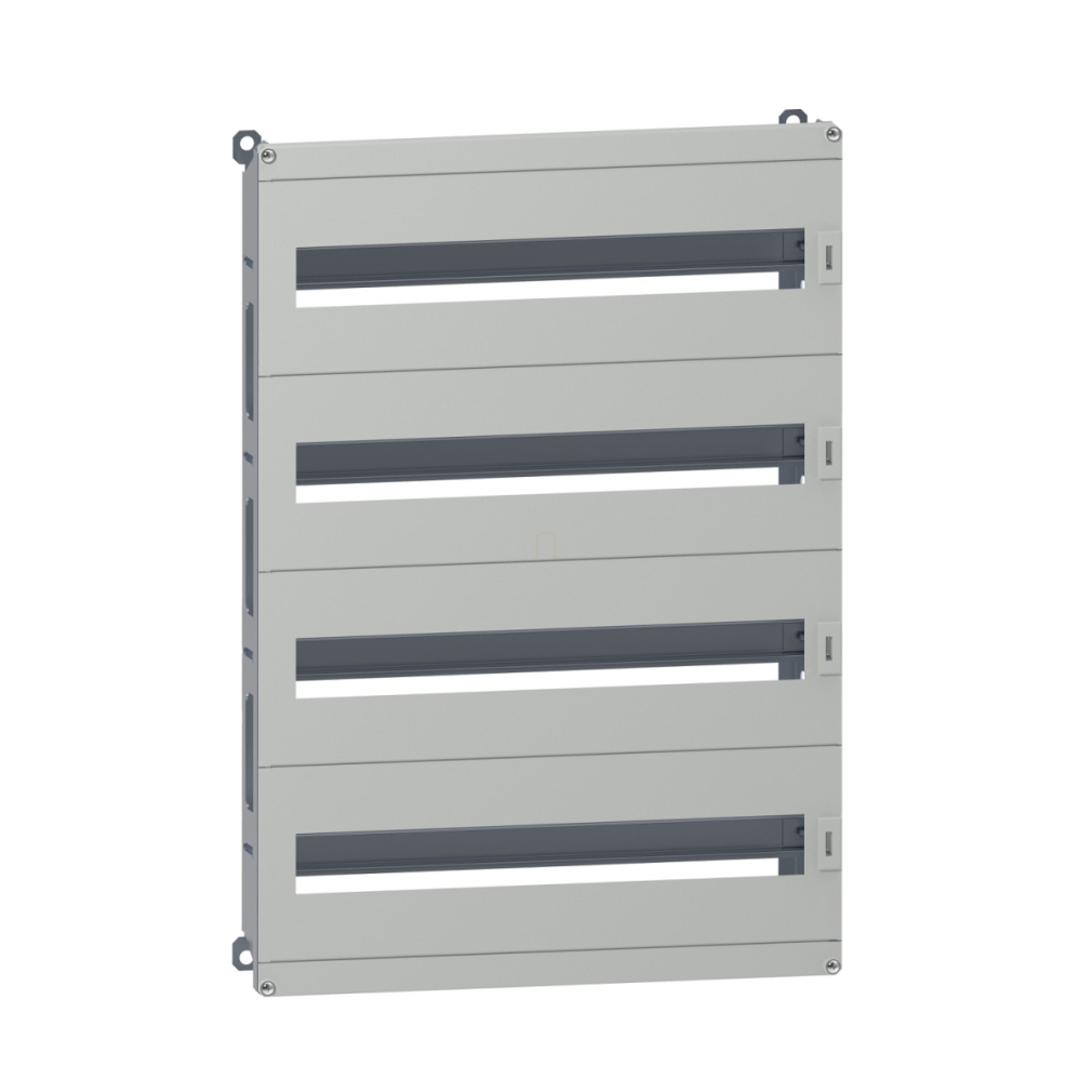 A NSYDLM88 DLM chassis felépítése kimondottan praktikus és átgondolt. A szerkezet 653 mm magas, 455 mm széles és 101,5 mm mély, így tökéletesen illeszkedik a H700 x W500 mm méretű PanelSeT szekrényekbe. A készlet egy masszív acél szerkezeti vázból, négy darab 35 mm-es DIN-sínnel ellátott előlapból, két fedőburkolatból, valamint egy 2 x 16 mm² + 5 x 6 mm² méretezésű nulla/föld csatlakozósávból áll. A szerelvény kompatibilis a PanelSeT S3D és PanelSeT CRN termékcsaládokkal, így a meglévő rendszerekbe is problémamentesen integrálható. Az előlapok szürke (RAL 7035) színűek, poliészter porbevonattal kezeltek, ami tartósságot és professzionális megjelenést biztosít.
