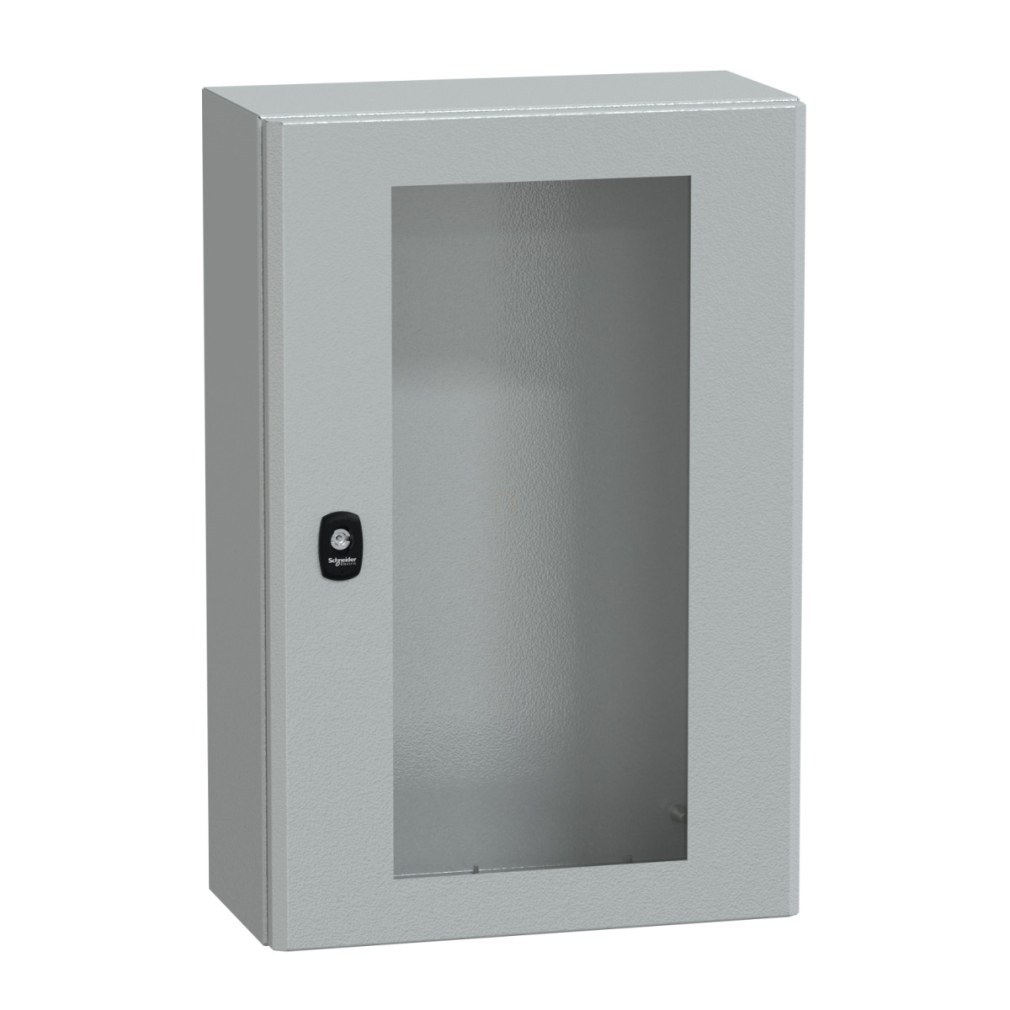 A PanelSeT S3D sorozat multi-purpose jellegéből adódóan rendkívül széles felhasználási területen alkalmazható. A szekrény teste erős, egyrészes kialakítású acélból készül, míg az ajtó kombinált acél és biztonsági üveg konstrukció. Az IP66-os védettségi szint biztosítja a tökéletes por- és vízvédelmet, így alkalmas akár kültéri vagy nedves, poros környezetben történő használatra is. Az IK08 besorolás pedig megfelelő mechanikai védelmet nyújt a külső behatásokkal szemben. A szekrény színe szürke (RAL 7035), felületkezelése epoxy-poliészter por bevonat, amely tartós és időjárásálló.