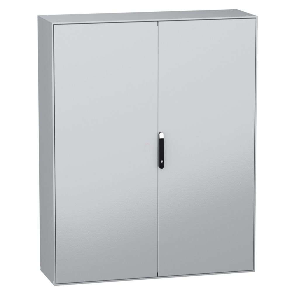 A NSYSM2016502DP szekrény konstrukciója egyetlen darabból álló vázzal és hegesztett hátsó panellel rendelkezik, míg az elülső része merev keretet alkot hegesztett sarkokkal, ami kivételes stabilitást biztosít. A szekrényt két ajtóval szerelték, amelyek 120 fokos nyitási szöget tesznek lehetővé, és 4 pontos zárrendszerrel, valamint 5 mm-es dupla rudas fogantyúval vannak ellátva. A zárrendszer fekete (RAL 9005) színű fogantyúval rendelkezik, míg a szekrény teste szürke (RAL 7035) színben készül, epoxy-poliészter porbevonattal, amely tartós felületet biztosít és ellenáll a környezeti hatásoknak.