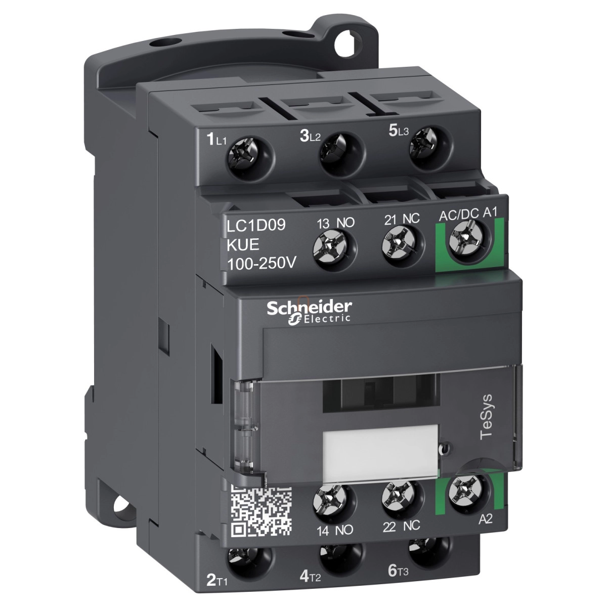 \nTeSys D mágneskapcsoló, 3p, <= 440V, 9A AC-3, 100...250V AC/DC tekercs. termékcsalád: TeSys - termék neve: TeSys D Green - termék vagy komponens típusa: mágneskapcsoló - készülék rövid megnevezése: LC1D - mágneskapcsoló alkalmazás: ellenálló töltés, motorvezérlés - felhasználási kategória: AC-1, AC-3 - pólusok megnevezése: 3P - pólus érintkező összetétel: 3 NO - vezérlőkör feszültség: 100...250 V AC 50/60 Hz, 100...250 V DC - tekercstípus: AC/DC elektronika - kiegészítő érintkező összetétel: 1 NO + 1 NC - túlfeszültség kategória: III - Ith konvencionális termikus szabad levegő áram: 10 A -<= 60 °C esetén jelző áramkör, 25 A -<= 60 °C esetén főáramkör - Irms névleges bekapcsolási teljesítmény: 140 A AC esetén jelző áramkör megfelel IEC 60947-5-1, 250 A -440 V esetén főáramkör megfelel IEC 60947, 250 A DC esetén jelző áramkör megfelel IEC 60947-5-1 - Icw névleges rövidzárlati kiállási áram: 100 A 1 s jelző áramkör, 105 A <= 40 °C 10 s főáramkör, 120 A 500 ms jelző áramkör, 140 A 100 ms jelző áramkör, 210 A <= 40 °C 1 s főáramkör, 30 A <= 40 °C 10 perc főáramkör, 61 A <= 40 °C 1 perc főáramkör - kapcsolt biztosíték méretezés: 10 A gG esetén jelző áramkör megfelel IEC 60947-5-1, 20 A gG -<= 690 V koordináció 2-es típus, koordináció esetén főáramkör, 25 A gG -<= 690 V koordináció 1-es típus, koordináció esetén főáramkör - Ui névleges szigetelési feszültség: 690 V esetén főáramkör megfelel IEC 60947-4-1, 690 V esetén jelző áramkör megfelel IEC 60947-1 - elektromos élettartam: 0.6 millió ciklus 25 A AC-1 Ue mellett <= 440 V - teljesítményveszteség pólusonként: 0.2 W AC-3, 1.56 W AC-1 - védőfedél: -val, -vel - szerelőtartó: lemez, sín - szabványok: CSA C22.2 No 60947-4-1, EN/IEC 60947-4-1, EN/IEC 60947-5-1, UL 60947-4-1 - termékbizonyítvány: CCC, CSA, EAC, KC, LROS (Lloyds register of shipping), UL - csatlakozás típusa: vezérlő áramkör : csavaros szorító kapcsok 1 kábel 1...4 mm² - kábel merevsége: szilárd, vezérlő áramkör : csavaros szorító kapcsok 2 kábel 1...4 mm² - kábel merevsége: szilárd - meghúzási nyomaték: főáramkör : 1.7 N.m - mellett csavaros szorító kapcsok - csavarhúzóval 2. sz. Philips, főáramkör : 1.7 N.m - mellett csavaros szorító kapcsok - csavarhúzóval Ø 6 mm-es lemez, vezérlő áramkör : 1.7 N.m - mellett csavaros szorító kapcsok - csavarhúzóval 2. sz. Philips, vezérlő áramkör : 1.7 N.m - mellett csavaros szorító kapcsok - csavarhúzóval Ø 6 mm-es lemez - üzemidő: 20...90 ms nyitás, 45...55 ms zárul - biztonság megbízhatósági szintje: B10d = 1369863 ciklus mágneskapcsoló névleges terheléssel megfelel EN/ISO 13849-1, B10d = 20000000 ciklus mágneskapcsoló mechanikai terheléssel megfelel EN/ISO 13849-1. Előnyök : .. Alkalmazások: A TeSys D mágneskapcsolók tökéletesen beépíthetők a vezérlőrendszerekbe, specifikus BL vagy BBE rendelési számok kompatibilisek 100mA vagy 500mA digitális I/O modulokkal....