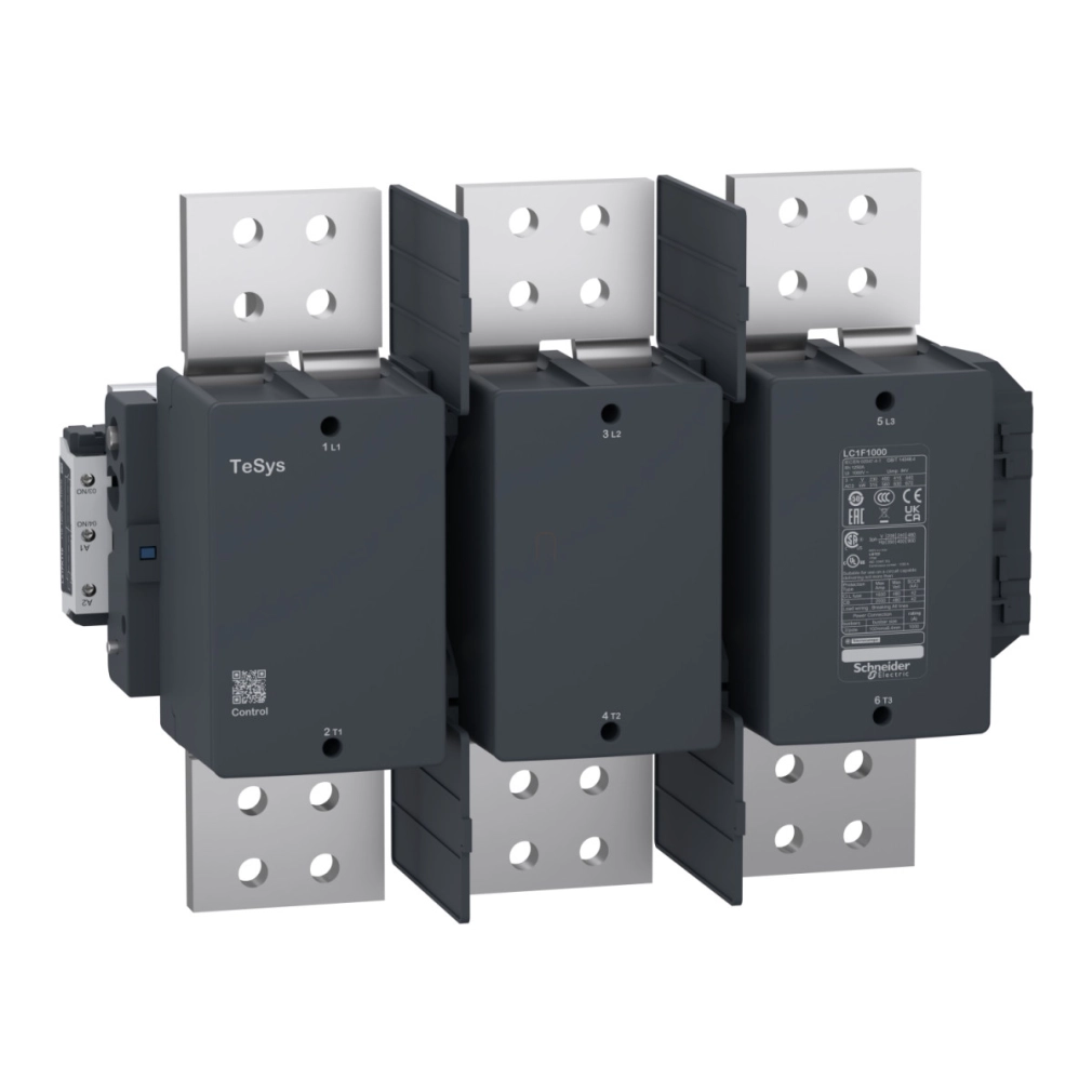 \nTeSys F mágneskapcsoló, 3p(3 NO), AC-3, <= 440 V 1000A, tekercs nélkül. termékcsalád: TeSys - termék neve: TeSys F - termék vagy komponens típusa: mágneskapcsoló - készülék rövid megnevezése: LC1F - mágneskapcsoló alkalmazás: ellenálló töltés, motorvezérlés - felhasználási kategória: AC-1, AC-3 - pólusok megnevezése: 3P - pólus érintkező összetétel: 3 NO - le névleges üzemi áram: 1000 A (<= 55 °C) -<= 440 V AC AC-3, 1250 A (<= 40 °C) -<= 440 V AC AC-1. Előnyök : .. Alkalmazások: ..