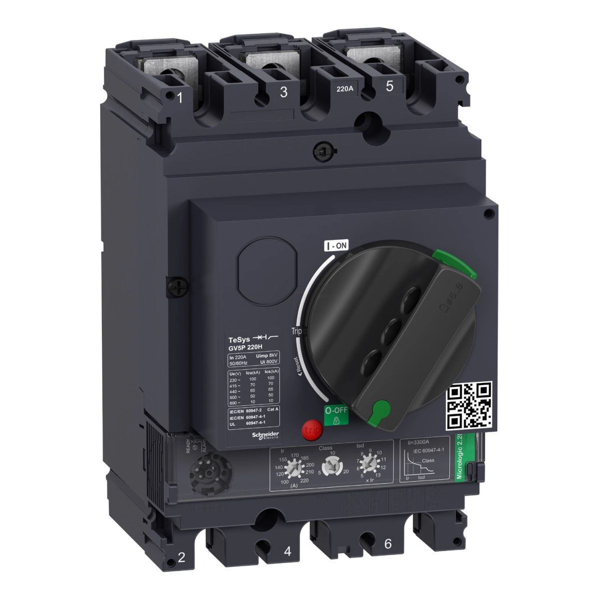 TeSys GV motoros megszakító, 3 pólusú (3P), 220A/690V, 90-110kW@400V 3-fázisú motorok védelmére. Termikus mágneses védelmet és kiegészítő védelmeket biztosít, Icu 70kA megszakító kapacitás, start-stop vezérlés forgókarral, rudak vagy kábelek csatlakoztatása sorkapcsokkal (kábelek közvetlen csatlakoztatása kiegészítő csatlakozókkal). A termikus védelem tárcsákkal állítható, Ir beállítási áram 100-220A tartományban és választható kioldási osztály 5, 10 vagy 20, mágneses védelem 15 In. A fix felvevővel ellátott további védelmek közé tartozik a rövid késleltetési védelem Isd 13 Ir-nél, a fázisegyenetlenség és a veszteségvédelem. Belső helyeket tesz elérhetővé további segédérintkezőblokkok (OF, SD) és feszültségkioldó egységek (MN, MX) számára. Több szabvány szerinti tanúsítással rendelkezik (IEC, UL, CSA, CCC, EAC, Marine), Green Premium szabványnak megfelelő (RoHS/REACh).