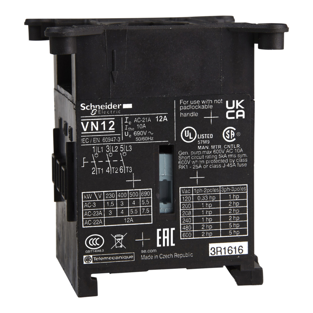 A TeSys Mini-VARIO VN12 modell 3 NO (normál nyitott) érintkezővel rendelkezik, és szimmetrikus sínre szerelhető. A készülék névleges üzemi feszültsége 690 V AC 50/60 Hz, míg a névleges lökőfeszültség-állóság 6 kV. A hagyományos szabad levegős hőáram 12 A, zárt környezetben pedig 10 A hőáramot biztosít. A névleges üzemi áram 8,1 A (AC-23) 400 V-on. A berendezés különböző névleges üzemi teljesítményekkel rendelkezik különböző alkalmazási területekre: 3 kW 400-415 V-on (AC-3), 4 kW 500 V-on (AC-3), 4 kW 690 V-on (AC-3), 1,5 kW 230-240 V-on (AC-3), valamint 5,5 kW 500 V-on (AC-23A), 7,5 kW 690 V-on (AC-23A), 3 kW 230-240 V-on (AC-23A) és 4 kW 400-415 V-on (AC-23A).