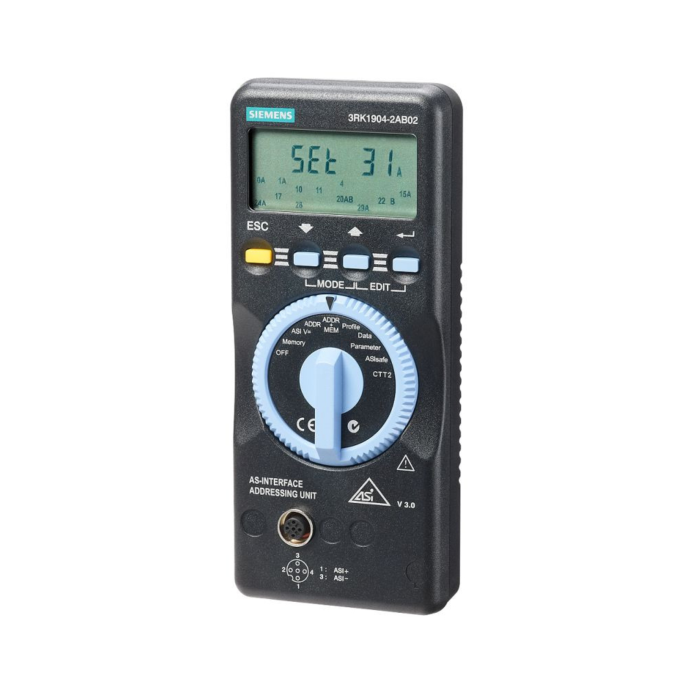 Siemens 3RK1904-2AB02 AS-I címző készülék V3.0, Tartozék: 4xAA elem, 1,5m-es M12-es címző kábel