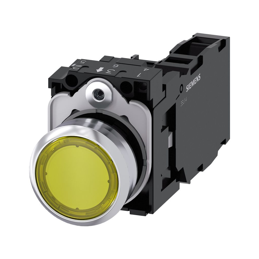 Siemens 3SU1152-0AB30-1FA0 komplett világító nyomógomb, sárga, 24VAC/DC, 1NO+1NC, fém csavaros Sirius