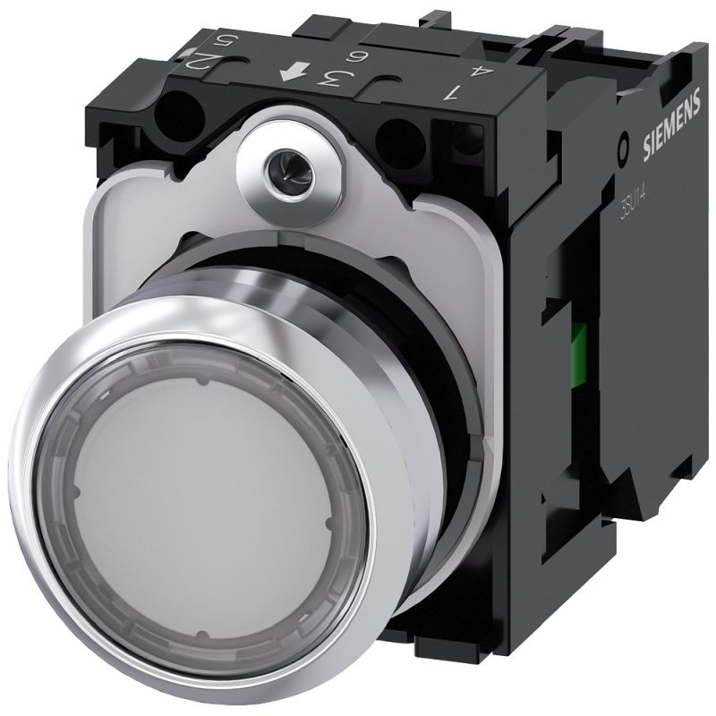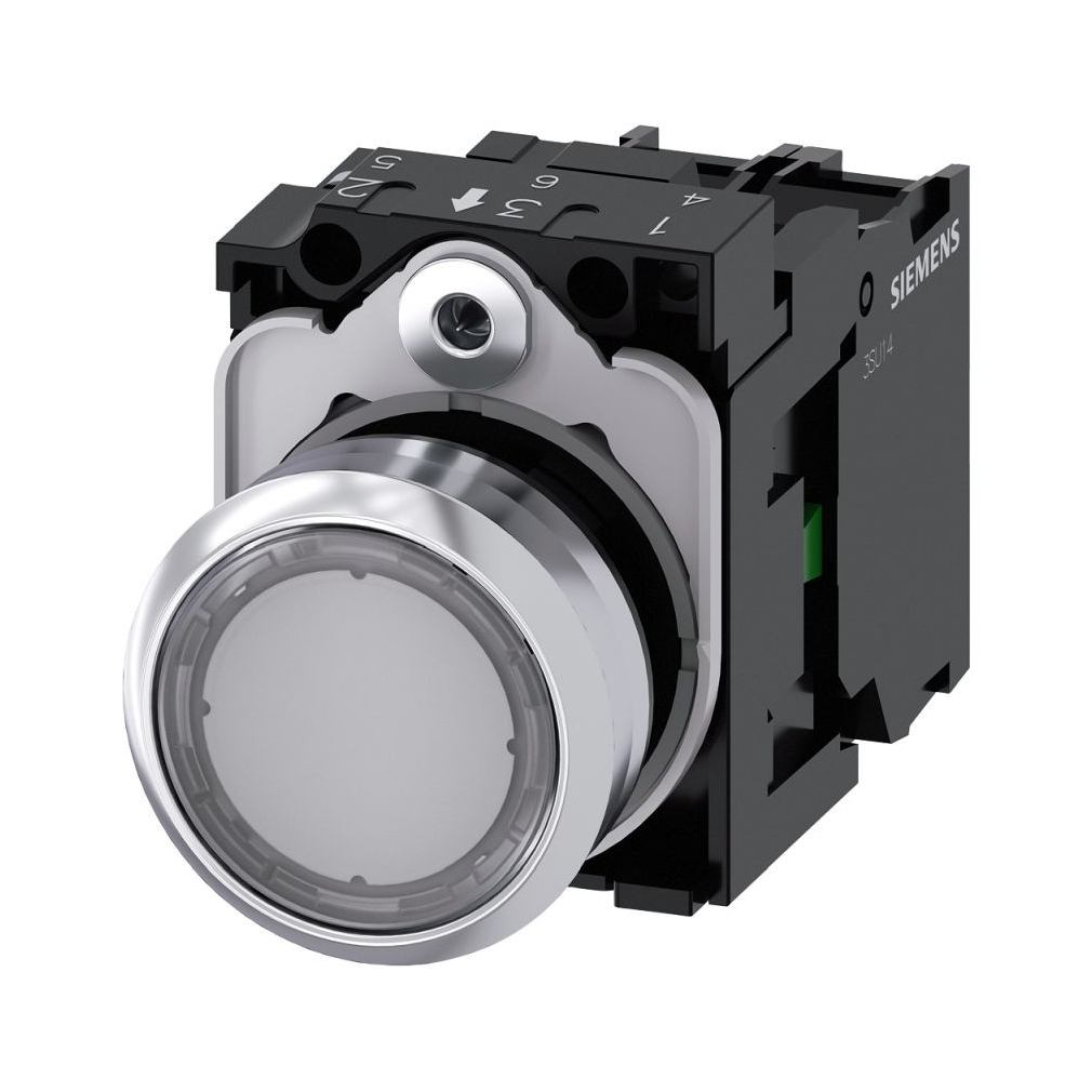 Siemens 3SU1156-0AB70-1BA0 komplett világító nyomógomb, átlátszó, 230VAC, 1NO, fém, csavaros Sirius