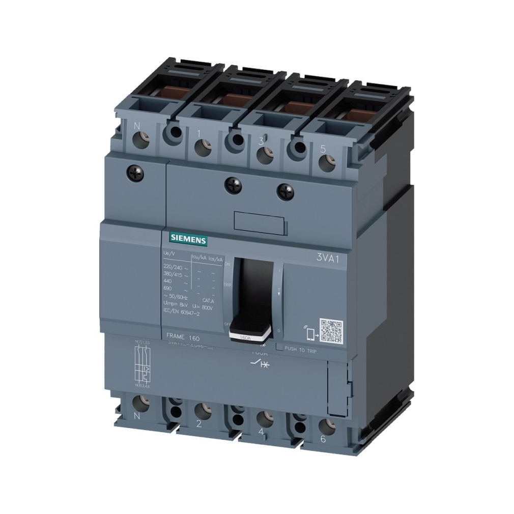 Siemens 3VA1110-4ED46-0AA0 kompakt megszakító 4P 100A 36kA, TM210 FTFM, vonalvédelem, nullavezető védelem nélkül, kengyeles csatlakozó