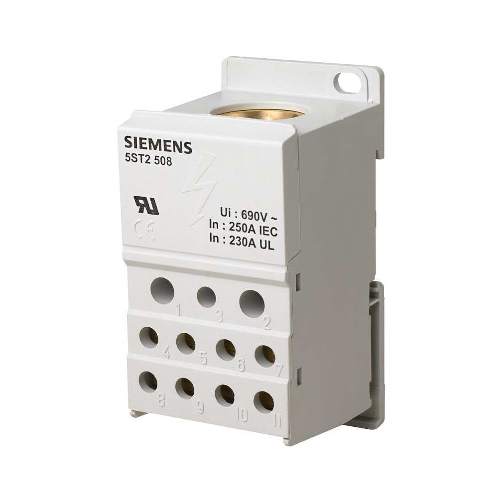 Elosztó blokk 1 pólusú, 250 A, 690 V\nA SENTRON 5ST2 elosztóblokk kiegészítő komponensként, miniatűr hibaáram-megszakítókként funkcionál, amely univerzálisan felszerelhető és könnyen telepíthető.