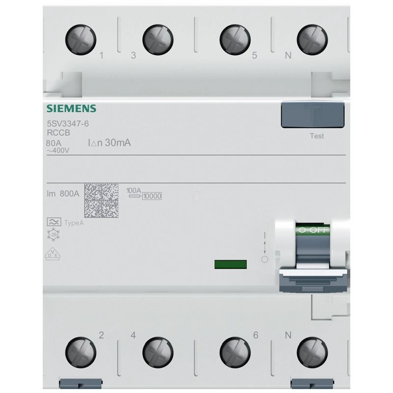 Maradékáramú megszakító, 4 pólusú, A típusú, Be: 80 A, 30 mA, Un AC: 400 V RCCB SENTRON 5SV3\n
