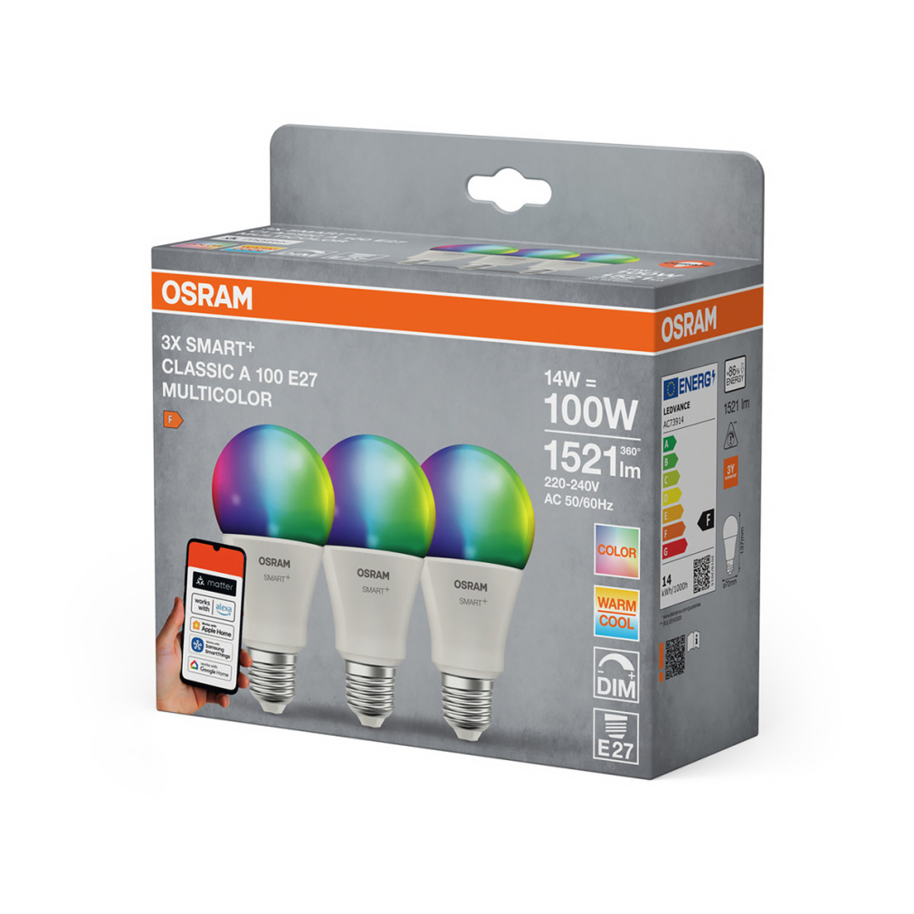 Osram Smart+ Matter Classic Multicolor E27 LED, 14 W, 1521 lm, 2700-6500 K +RGB, dimmelhető, 3 darabos