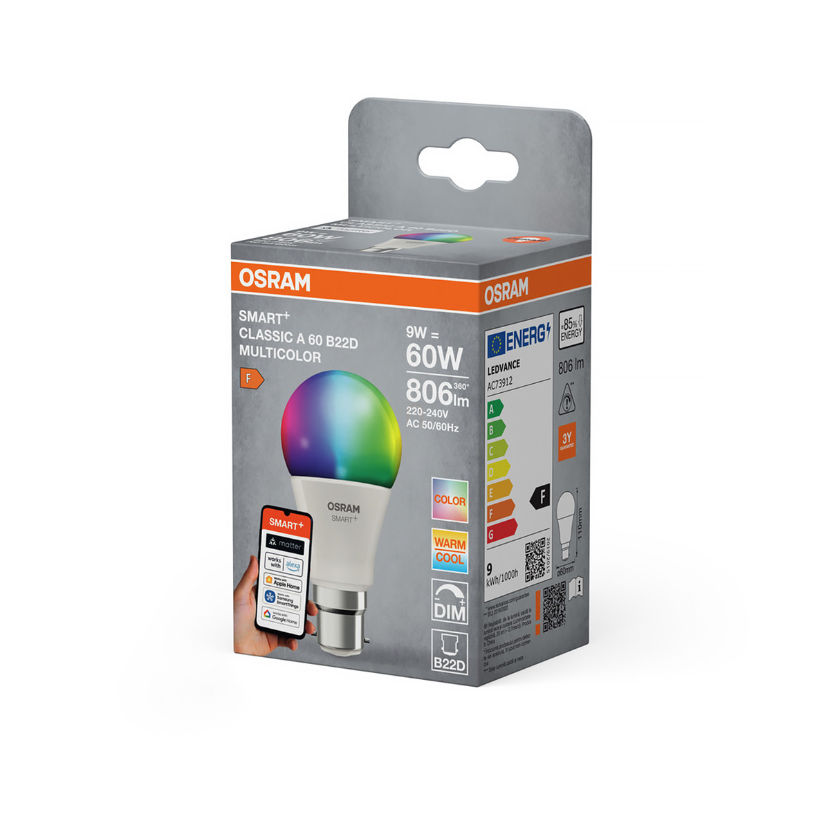 Osram Smart+ Matter Classic Multicolor B22d LED, 9 W, 806 lm, 2700-6500 K +RGB, dimmelhető