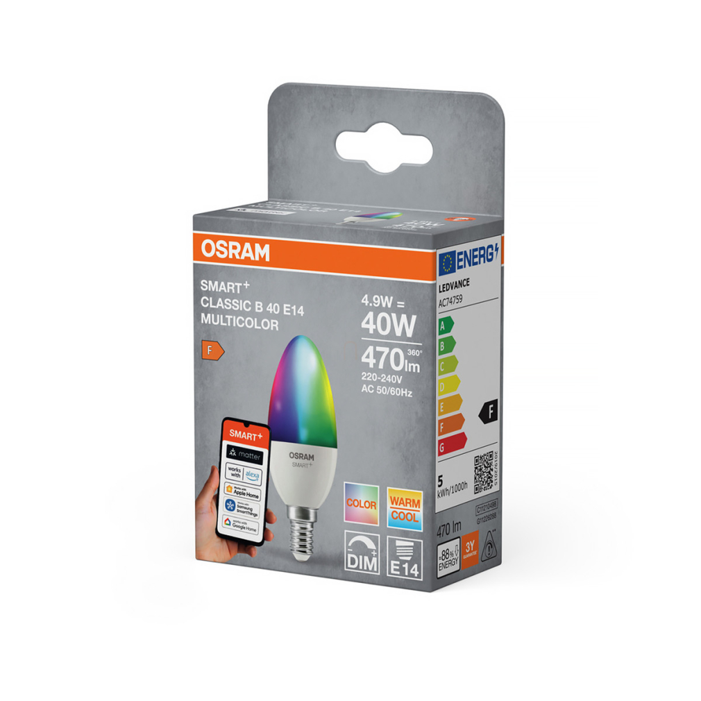 Osram Smart+ Matter Classic Multicolor E14 LED, 4,9 W, 470 lm, 2700-6500 K +RGB, dimmelhető