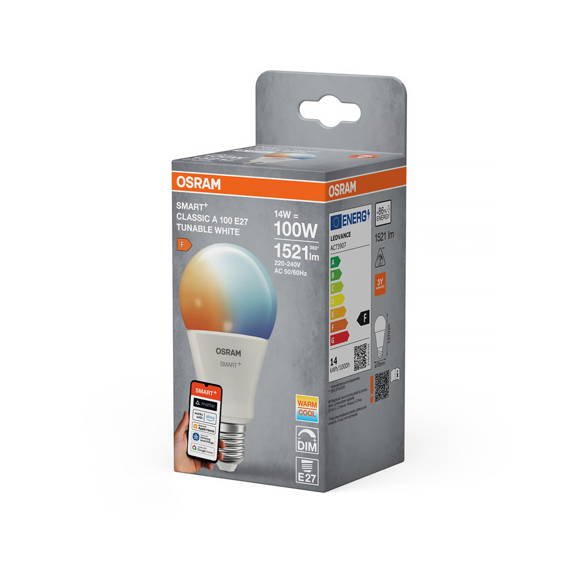 Osram Smart+ Matter Classic E27 LED, 14 W, 1521 lm, 2700-6500 K, dimmelhető