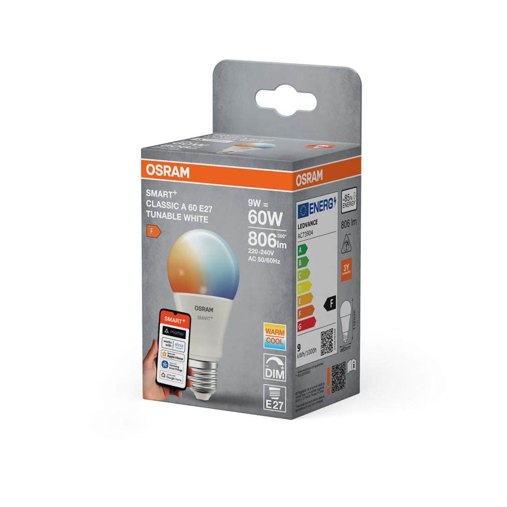 Osram Smart+ Matter Classic E27 LED, 9 W, 806 lm, 2700-6500 K, dimmelhető