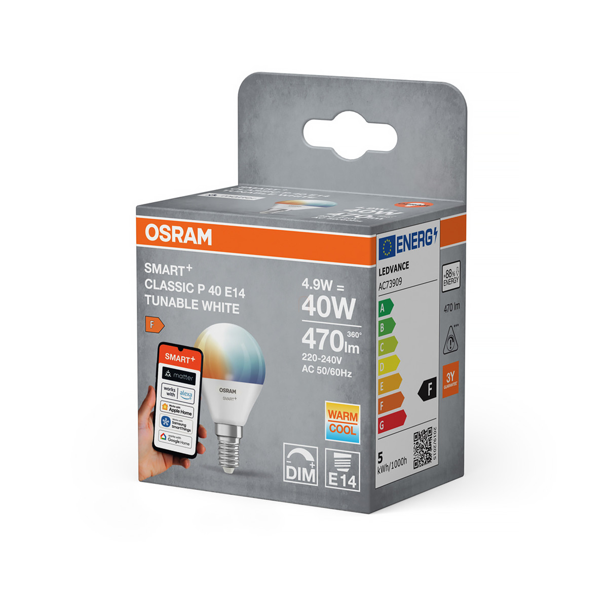 Osram Smart+ Matter Classic E14 LED kisgömb, 4,9 W, 470 lm, 2700-6500 K, dimmelhető