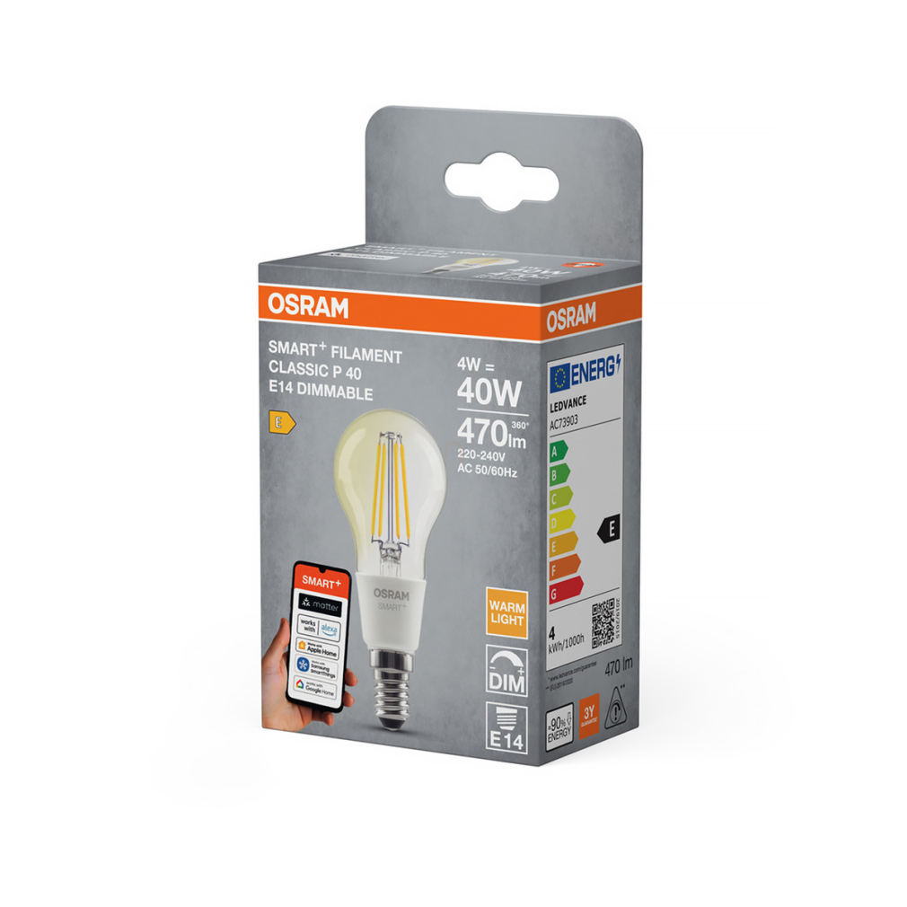 Osram Smart+ Matter Filament Classic E14 LED kisgömb, 4 W, 470 lm, 2700 K, dimmelhető