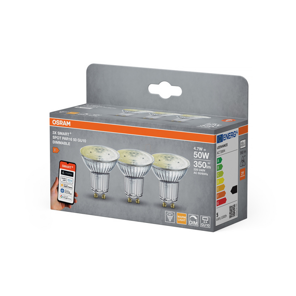 Osram Smart+ Matter Classic PAR16 GU10 LED, 4,7 W, 350 lm, 2700 K, dimmelhető, 3 darabos